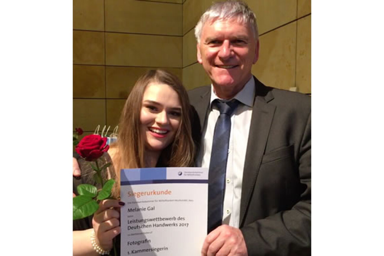 Beim Leistungswettbewerb des Deutschen Handwerks 2017 erreichte die Schülerin der Beruflichen Schule 6, Melanie Gal, den 1. Platz. Frau Gal begann im September 2015 bei der Firma Foto Seitz in Nürnberg eine zweijährige Ausbildung zur Fotografin mit dem Schwerpunkt Portrait. Obwohl Frau Gal die Ausbildung um ein Jahr verkürzt hat, ist es Ihr gelungen dieses herausragende Ergebnis zu erzielen. Die Berufliche Schule 6 gratuliert der 1. Kammersiegerin im Wettbewerbsberuf Fotografin und wünscht Ihr für die Zukunft weiterhin viel Erfolg.