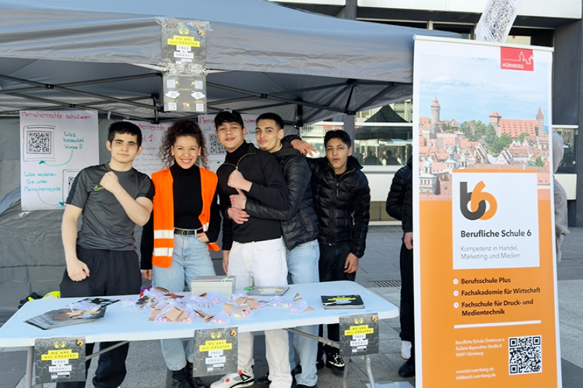 Unter dem Motto "Menschenrechte schützen" fand am 28.03.2025 die gemeinsame Aktion der SOR-SMC-Schulen statt. Im Rahmen der Nürnberger Wochen gegen Rassismus und der Koordination durch den Bezirksjugendring Mittelfranken machte die B6 auf den Artikel 1 der Menschenrechte aufmerksam und informierte Passanten sowie Schülerinnen und Schüler am Kornmarkt über Würde, Gleichberechtigung und Zivilcourage und regte zum Nachdenken und Diskutieren an.
