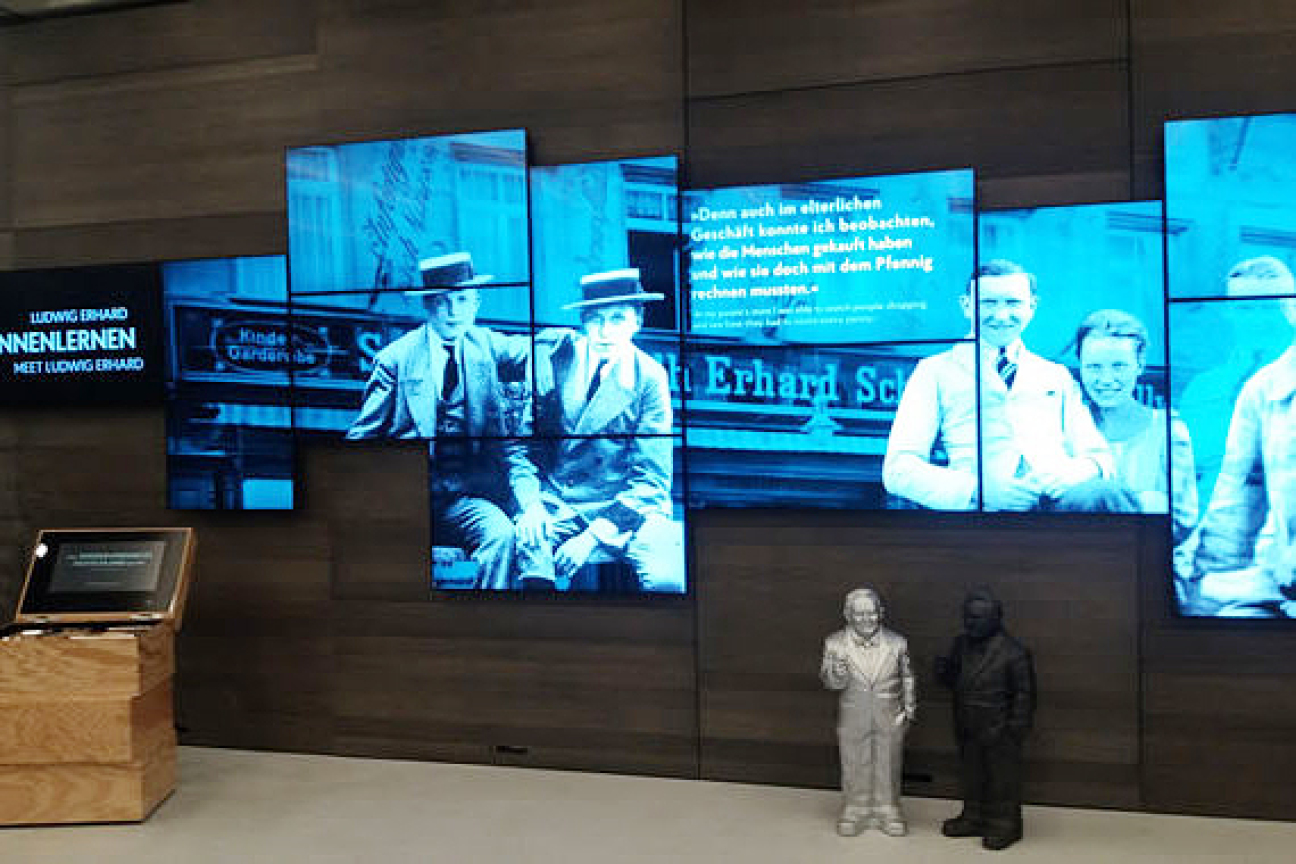 Der Rundgang startet im Geburtshaus Erhards, in dem der Bogen von seiner Geburt 1897 über den Ersten Weltkrieg bis zum Kriegsende 1945 gespannt wird. Der bekannte Fürther Kabarettist Volker Heißmann begleitet mit unterhaltsamen Kurzfilmen die geschichtliche Entwicklung. Der moderne Neubau stellt Erhards Wirken als Bundeswirtschaftsminister und Bundeskanzler sowie die Idee der Sozialen Marktwirtschaft vor.