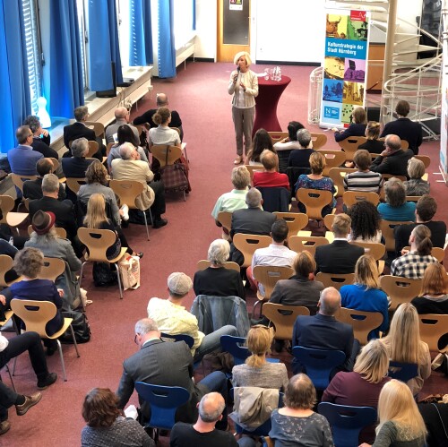 Der Prozess der Erarbeitung der Kulturstrategie machte deutlich, wie groß der Wunsch nach Diskurs in der (Nürnberger) Kulturszene ist. Unterschiedliche Formate aus dem städtischen Bereich greifen inzwischen diesen Wunsch auf: So wurde neben den Veranstaltungen des Bewerbungsbüros zur Kulturhauptstadt Europas 2025 und den vom Amt für Kultur und Freizeit organisierten „Kulturwerkstattgesprächen Auf AEG“ die Reihe „Kulturdebatten/Debattenkultur“ ins Leben gerufen, die aktuelle kulturpolitische Schwerpunktthemen in den Blick nimmt. In der ersten Veranstaltung stand das zukünftige „Haus des Spiels“ im Pellerhaus, im März die Entwicklung eines zukunftsgerichteten Vermittlungskonzepts für Zeppelintribüne und Zeppelinfeld im Vordergrund.