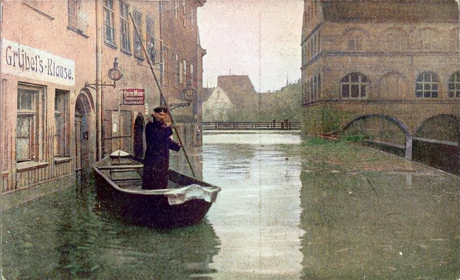 Im Februar 1909, nach der Schneeschmelze, war der Hochwasserstand besonders hoch, auch der gesamte Hauptmarkt mit dem damaligen Neptunbrunnen stand unter Wasser.