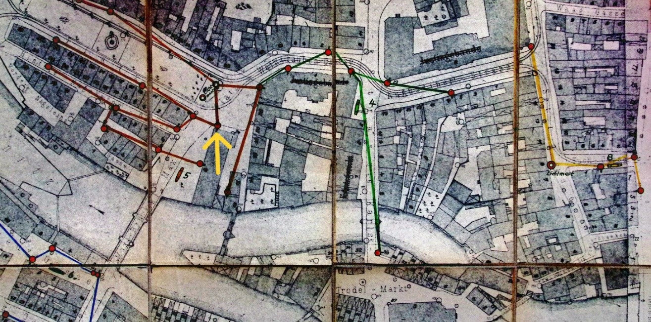 Rot: der Kahnbezirk um den Weinstadel mit der Öse an der oberen linken Ecke (gelber Pfeil)