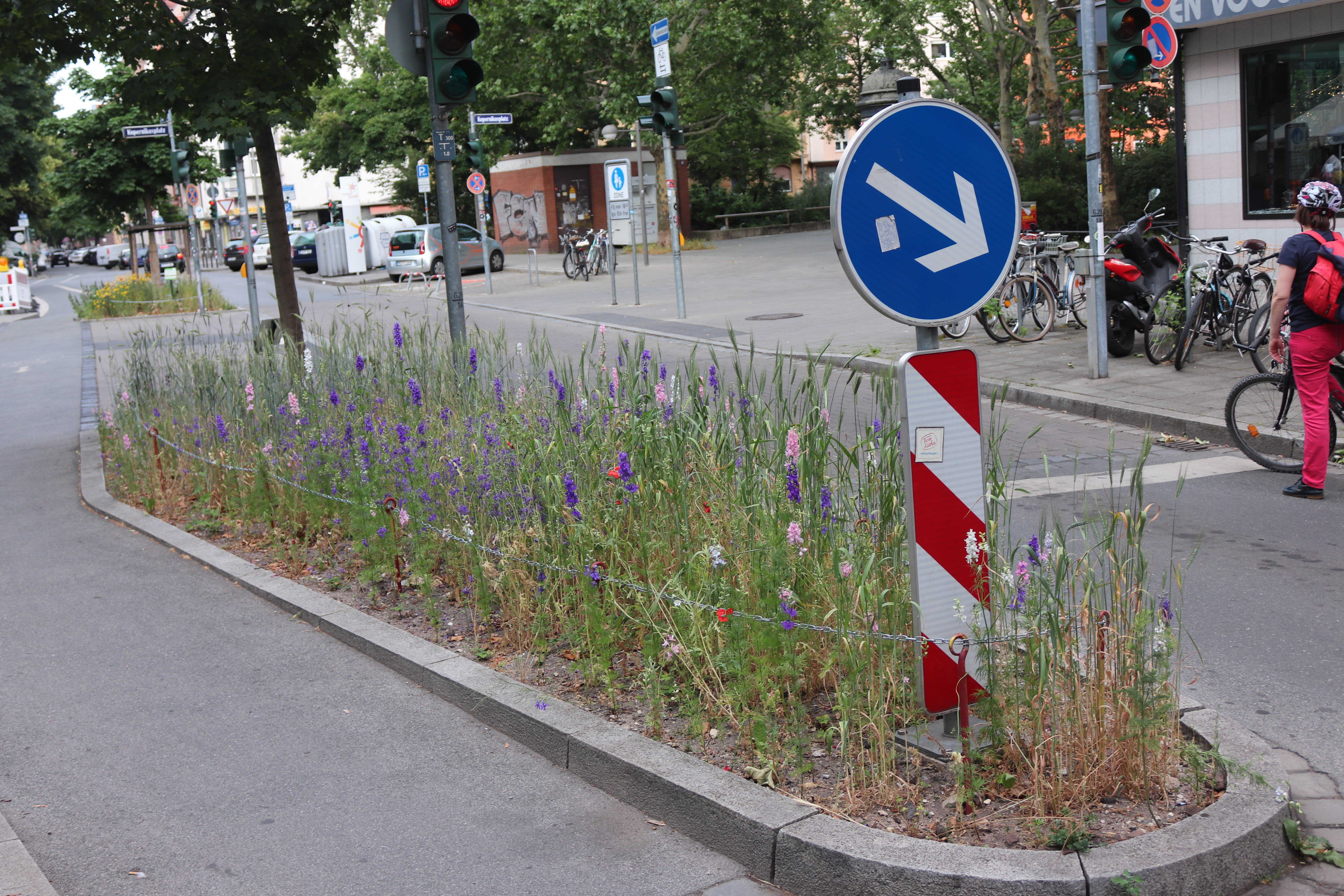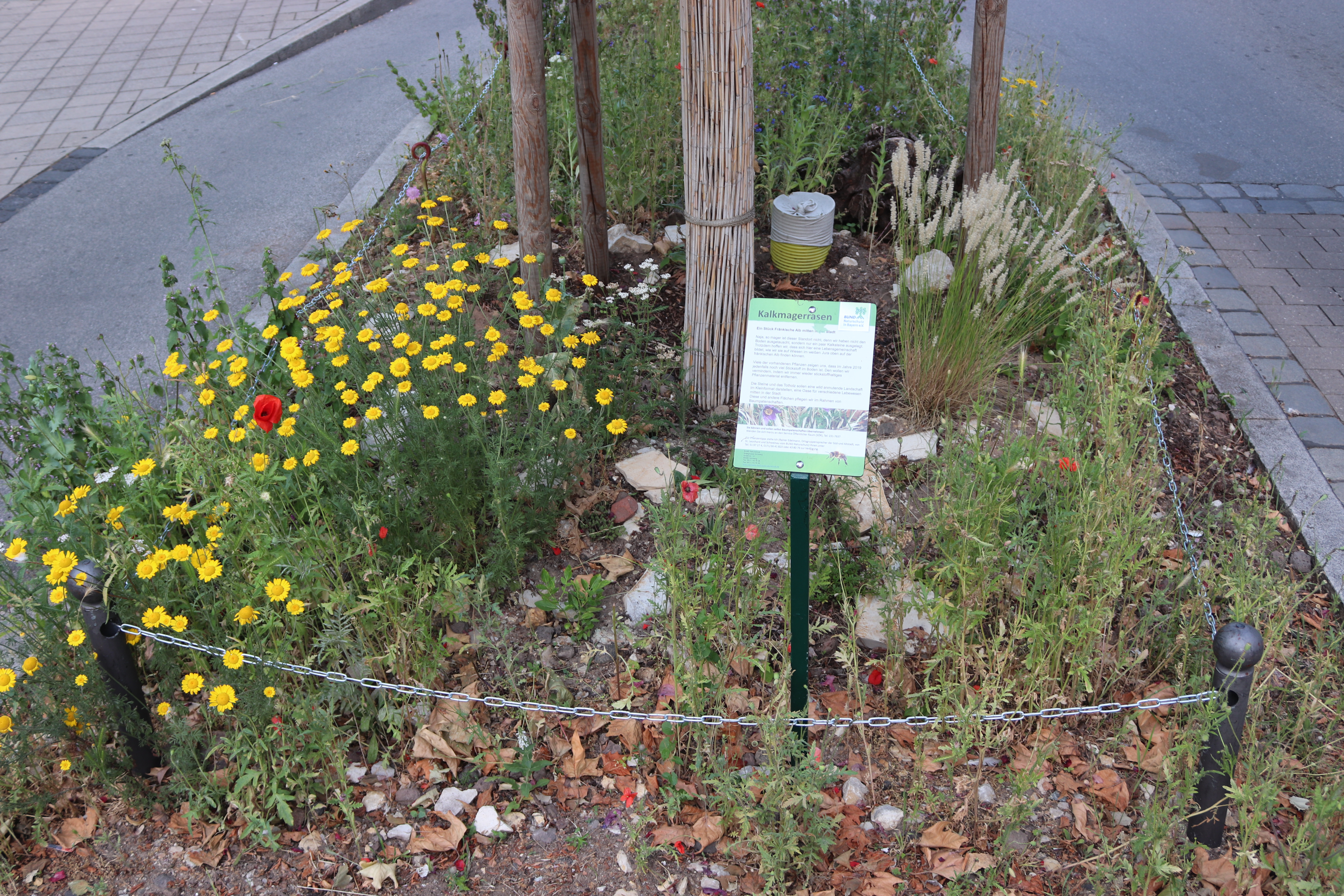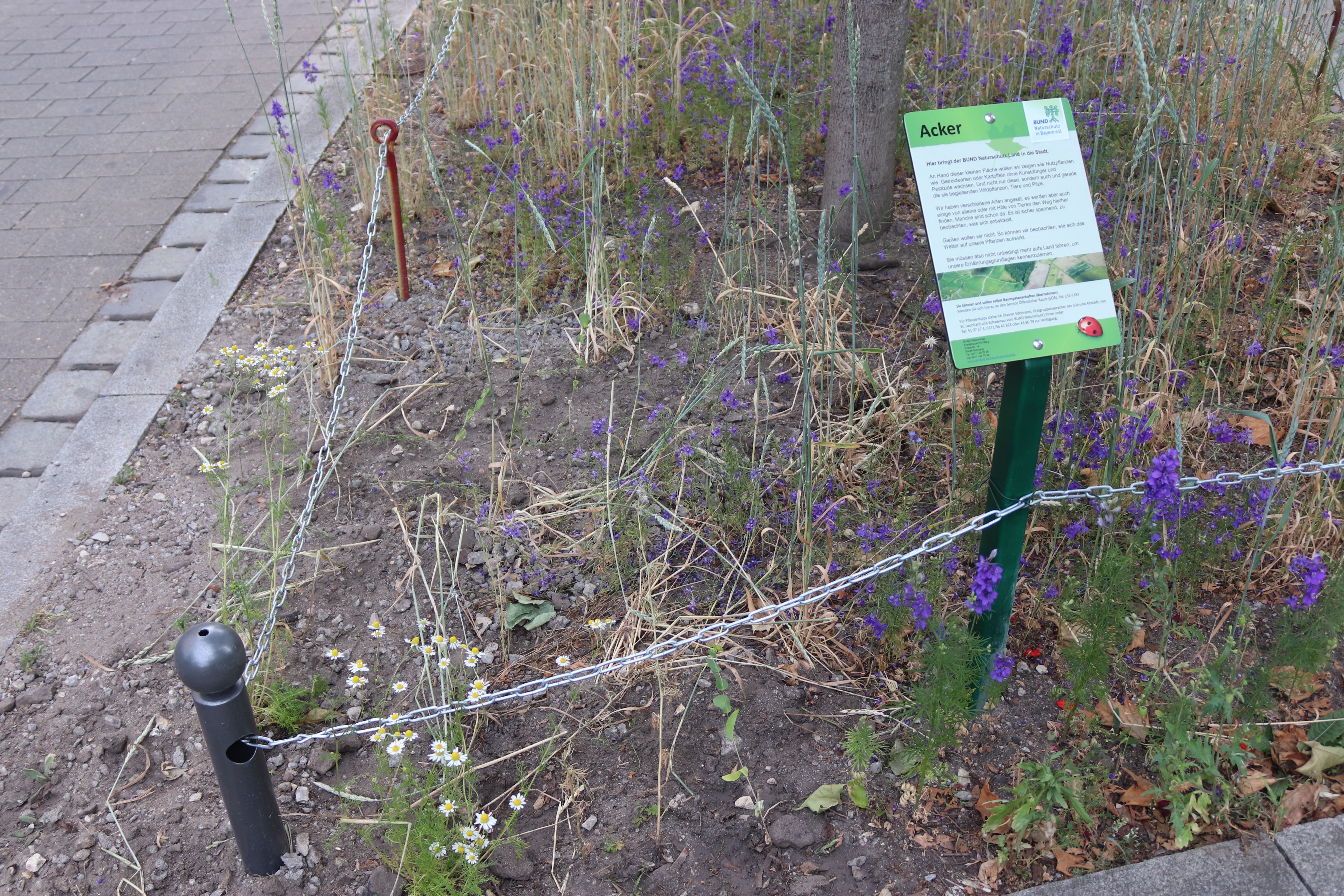 Bei der Noris-Inklusion holten die Paten für ihre Gutscheine einheimische Stauden, die zum Teil ganz gut ins ökologische Konzept passten, und pflanzen diese auf die Baumscheiben. Für den Sandtrockenrasen wurden viele Pflanzen vom Gebiet Brunecker Straße geholt. Die Baumscheibe westlich des Fußgängerüberweges wurde als Acker mit verschiedenen, auch urtümlichen Getreidearten und Ackerwildpflanzen besät. Wildpflanzensamen wurden auch auf den übrigen zwei Baumscheiben verteilt.