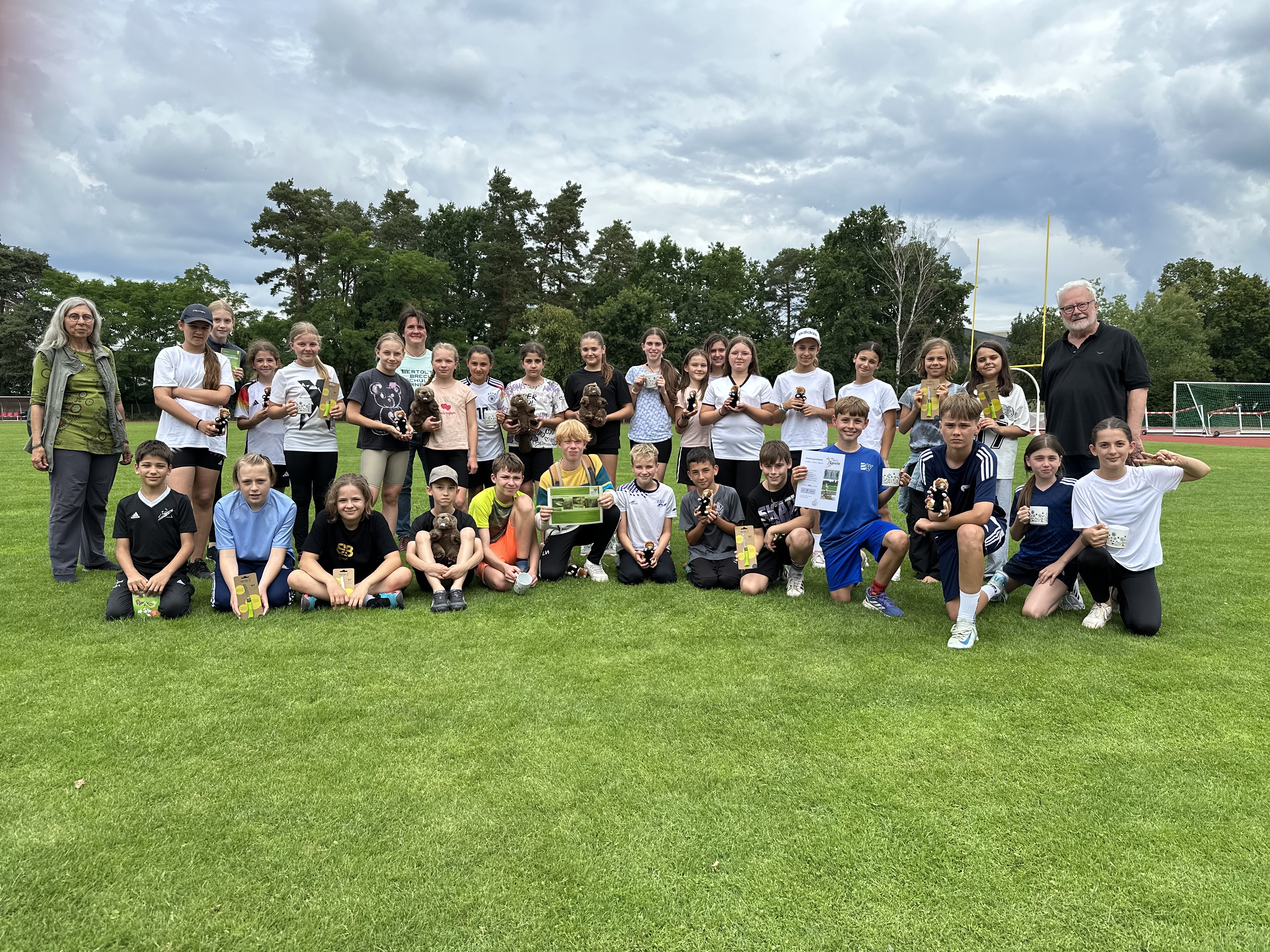 Ein gemeinsames Foto zeigt die geehrten Kinder zusammen mit Frau Carolin Stettner (hinten Mitte), die als betreuende Biologielehrerin das Projekt seit Jahren organisiert, sowie Frau Treutter (links) und Herrn Murawski (rechts).