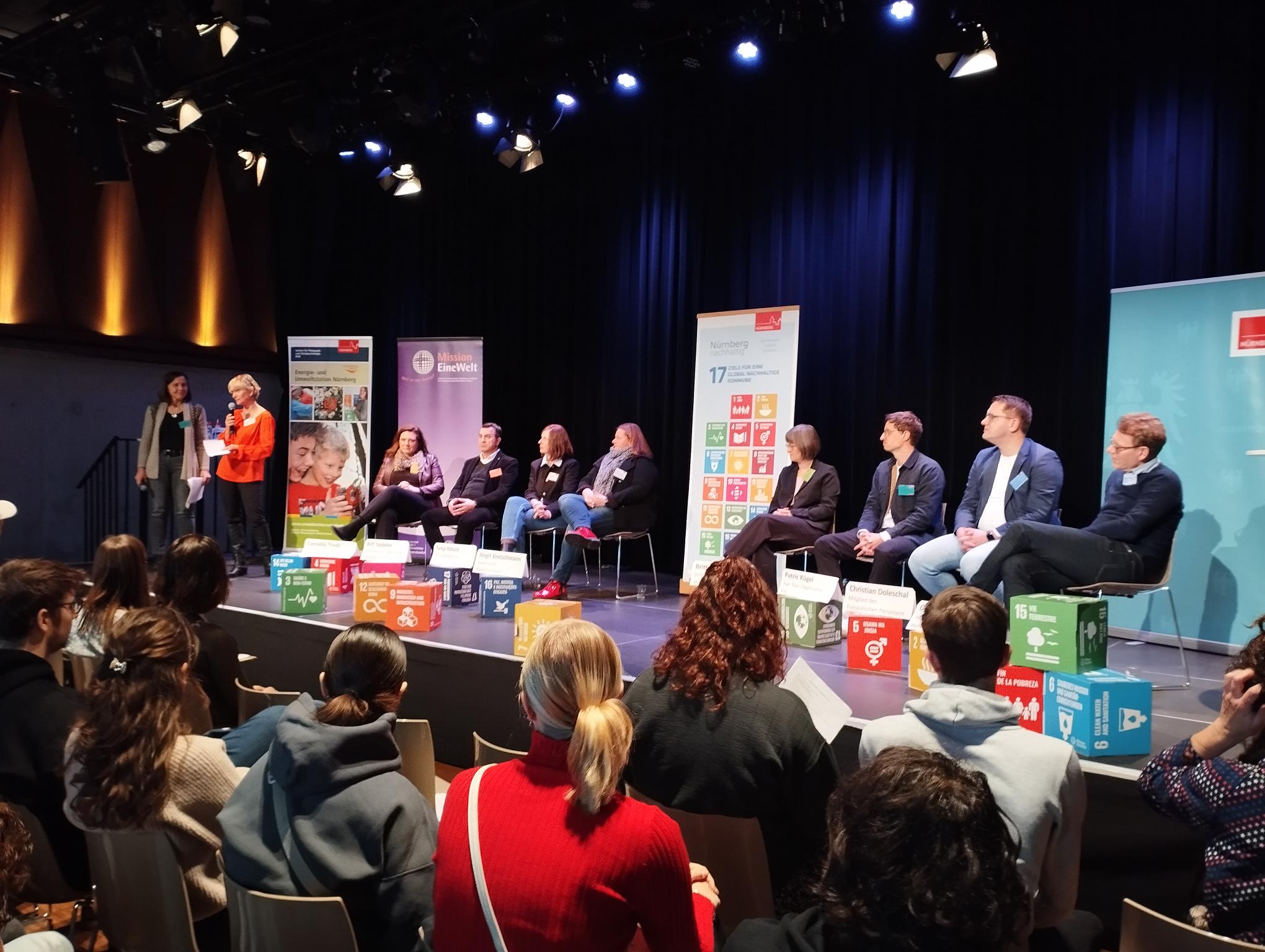 Mit diesem Thema beschäftigten sich die Schülerinnen und Schüler der AS13 bei dem dreitägigen Projekt "Nachhaltig wirtschaften – Mitmischen in der Einen Welt" der Energie- und Umweltstation Nürnberg sowie der Mission EineWelt. Fünf Klassen Klassen aus Nürnberger Schulen trafen sich zur Abschlussveranstaltung in der Kulturwerkstatt - Auf AEG! und Politiker und Politikerinnen sowie Vertreterinnen und Vertreter aus der Wirtschaft beantworteten Fragen zu diesem Thema.