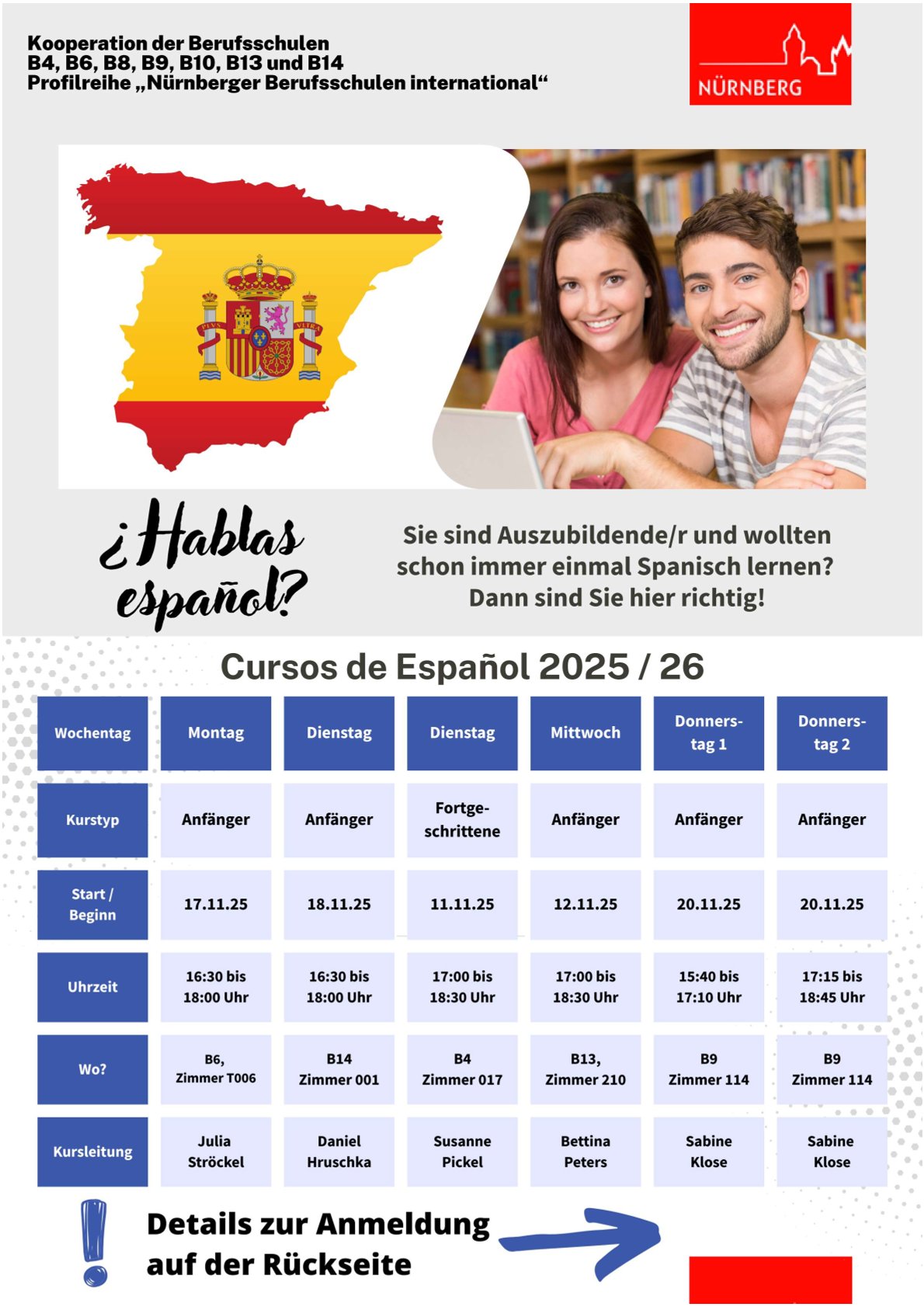 Auch im aktuellen Schuljahr bietet die städtische FOS Nürnberg wieder die Möglichkeit, das Wahlfach Spanisch zu belegen – ideal für alle, die die Sprache neu lernen oder vorhandene Kenntnisse vertiefen möchten.