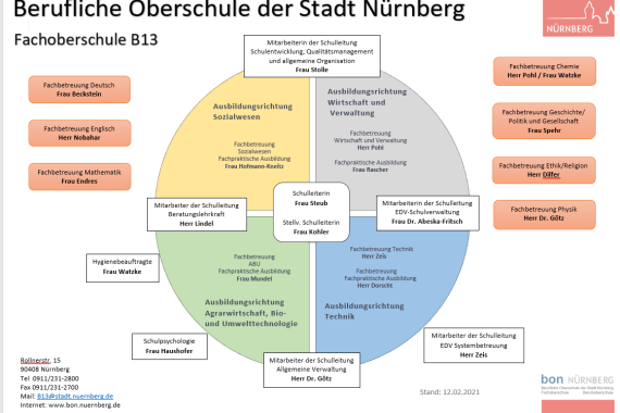 Unser SchulleitungsteamSchulleiterin: Frau OStDin Barbara MaierStellvertretende Schulleiterin: Frau StDin Alexandra StolleBei Fragen wenden Sie sich bitte an:Tel. 0911/231-2800Fax 0911/231-2700Mail: B13@stadt.nuernberg.de