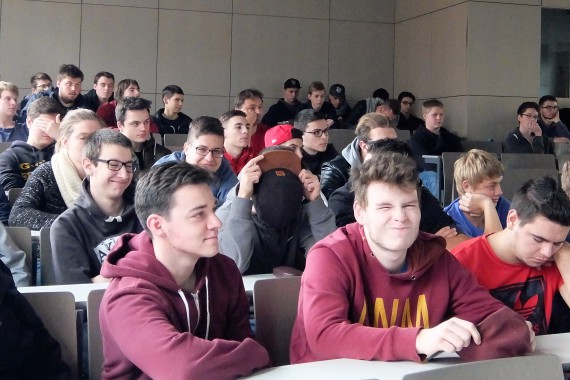 Ein Wahl-Clip von den Simpsons, der die Präsidentschaftswahlen parodierte, bot die Überleitung zum zweiten Vortrag. Auch hier saßen wieder 75 Azubis aus drei weiteren Klassem im Publikum.