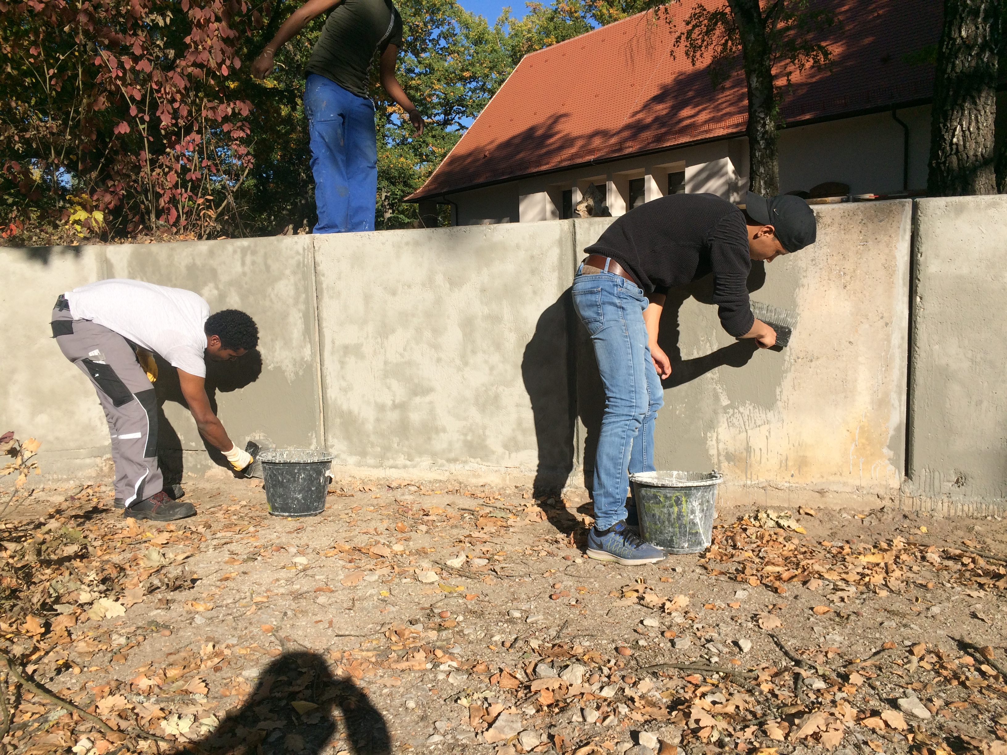 Schüler der BFSB 11 mauern Fachwerkwände aus, verputzen, legen Gewebe ein und streichen die Gefache.