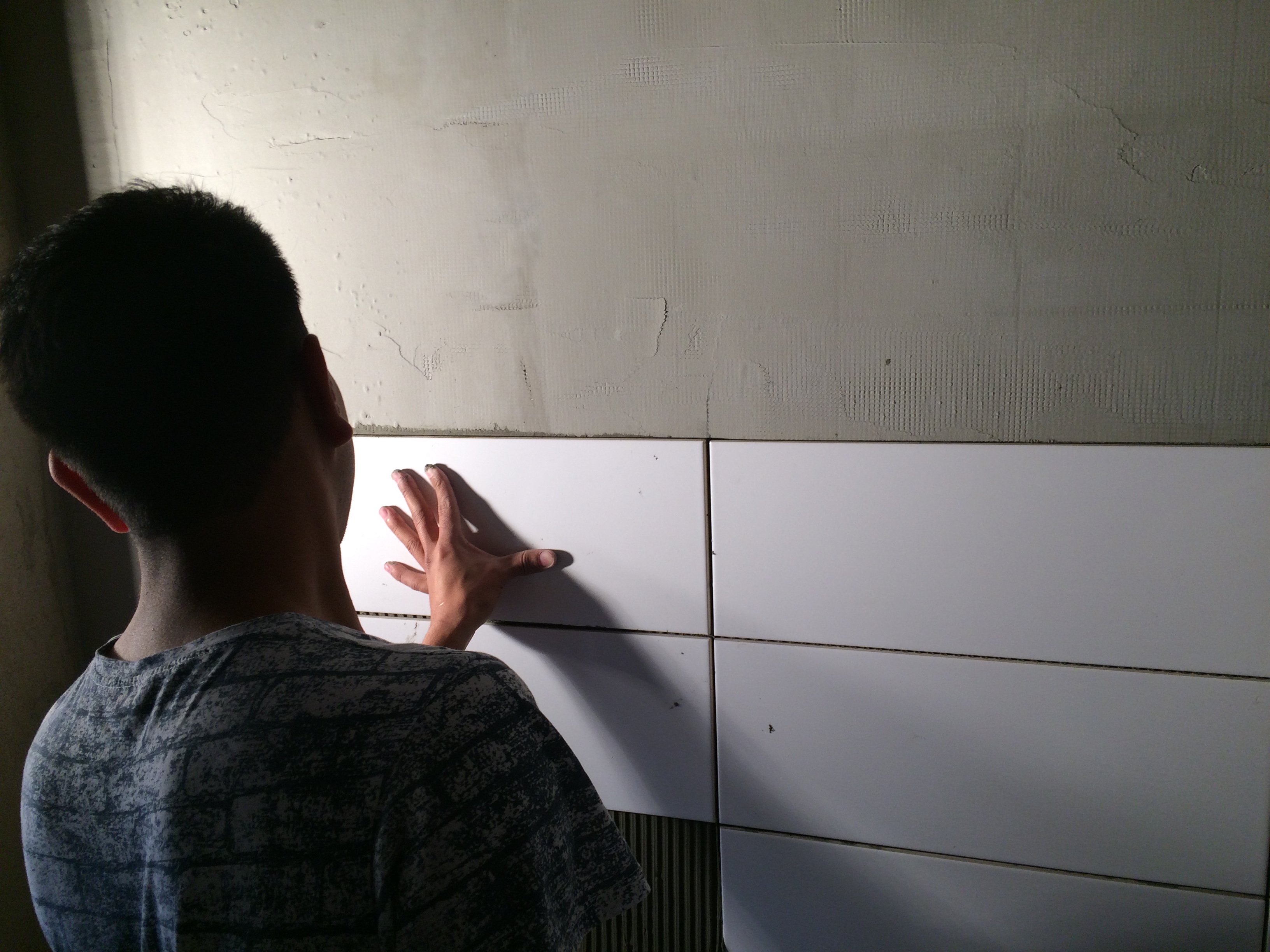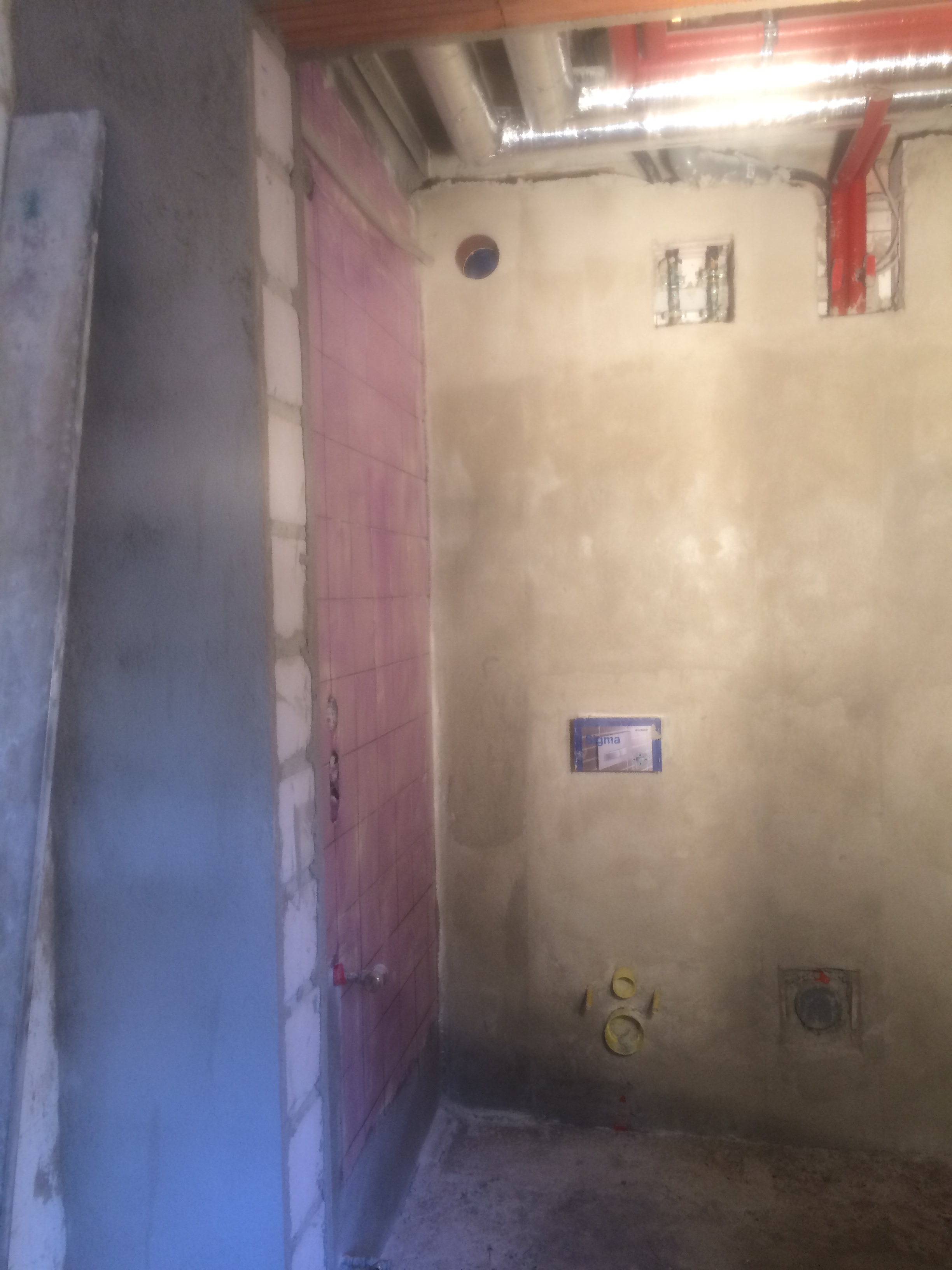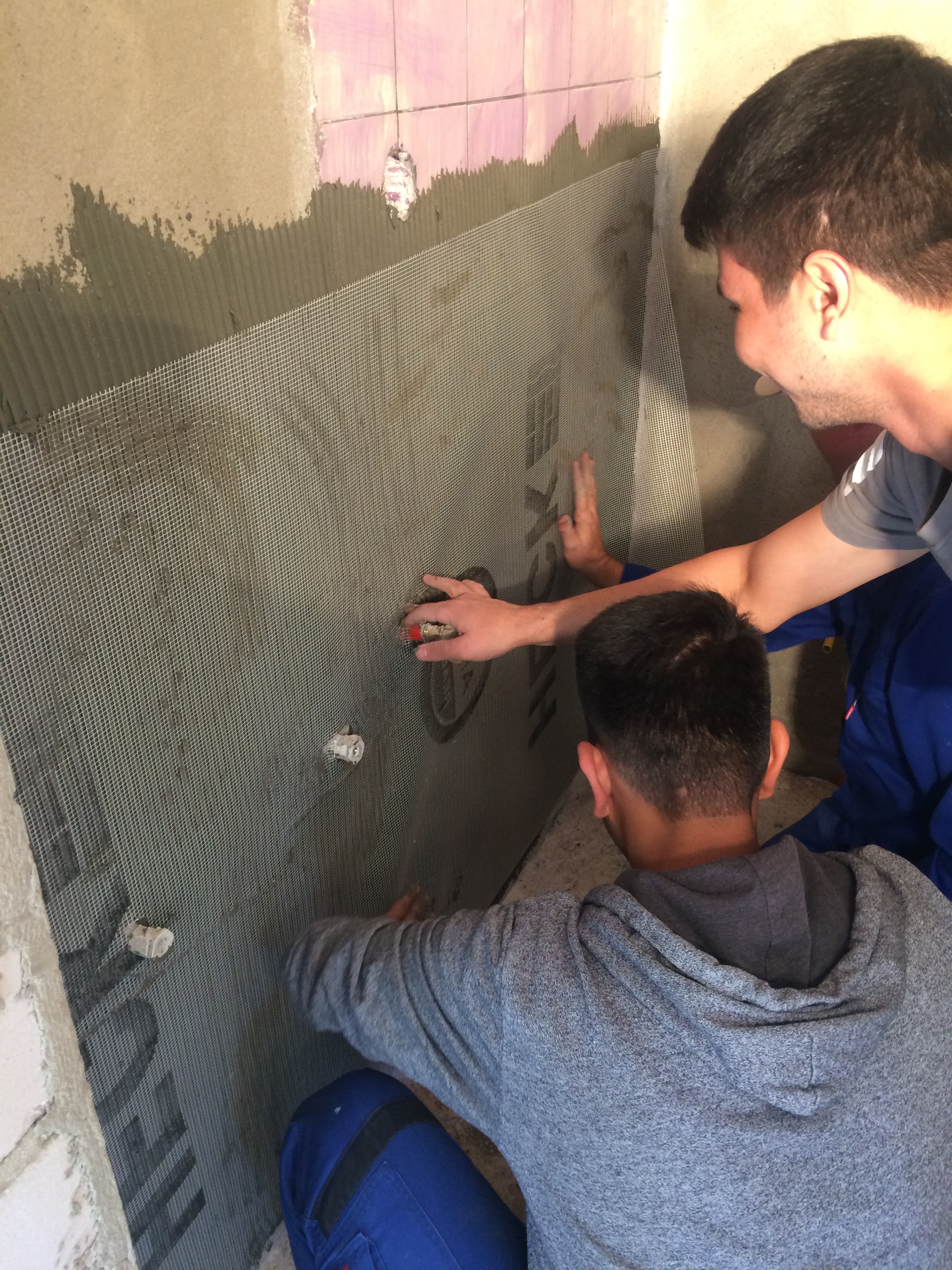 Hier wird Fliesenkleber auf die Beplankung der Vorwandinstallation aufgetragen.