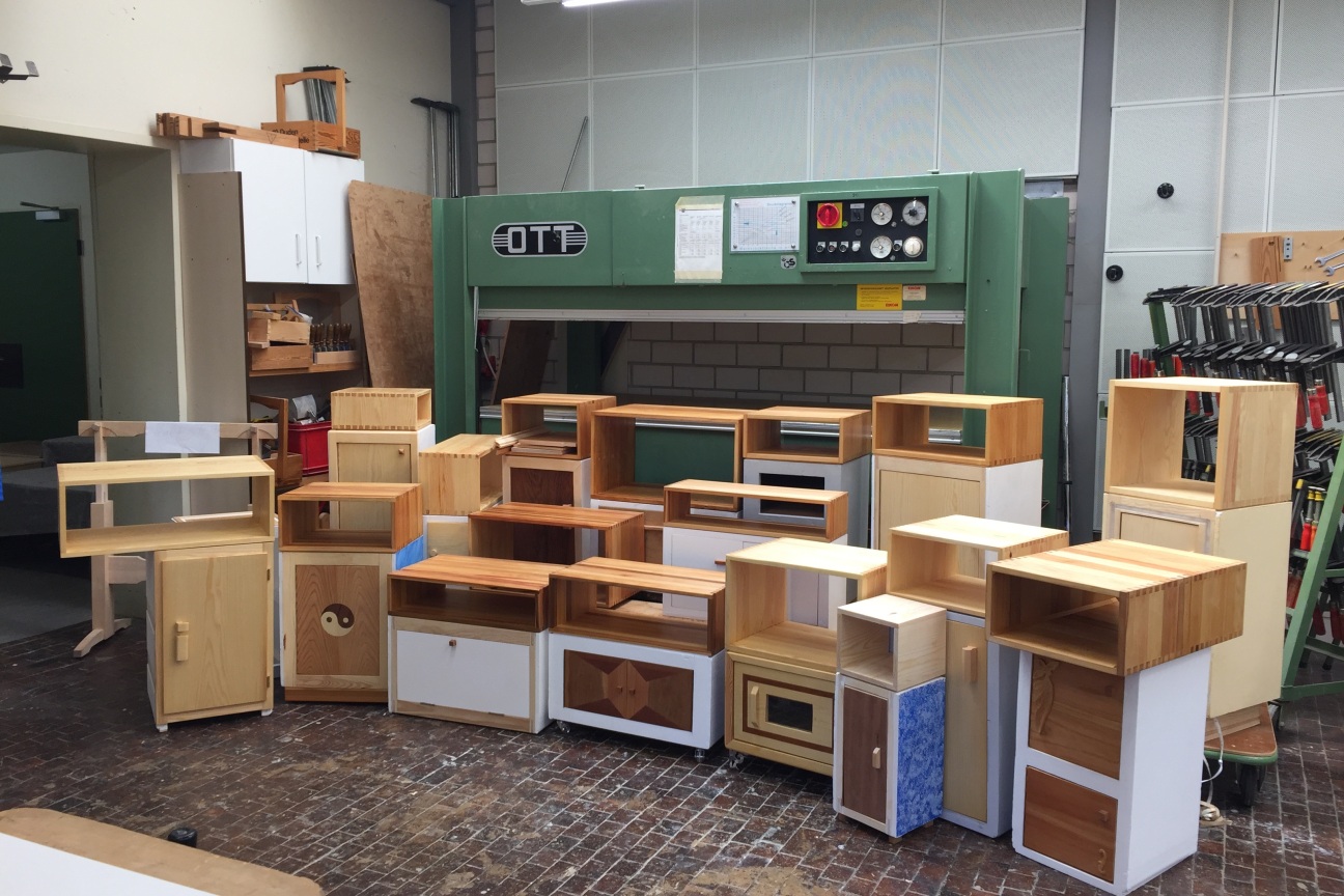 Nachdem die Bänke in der Sportumkleide ausgedient hatten und entsorgt werden sollten, hatten wir die Idee, das Holz wiederzuverwerten. Nach Demontage, Verleimen der einzelnen Bretter zu einer großen Fläche und Vorbearbeitung, konnten die Schüler daraus einen individuell entworfenen Vollholzkorpus bauen. Durch die unterschiedlichen Schattierungen der einzelnen Bretter ergaben sich daraus sehr schöne einzigartige Werkstücke. Mit diesem Projekt haben wir den Umweltpreis der Stadt Nürnberg gewonnen. Die Preisverleihung fand mit Bürgermeister Vogel und Umweltreferent Dr. Peter Pluschke statt.