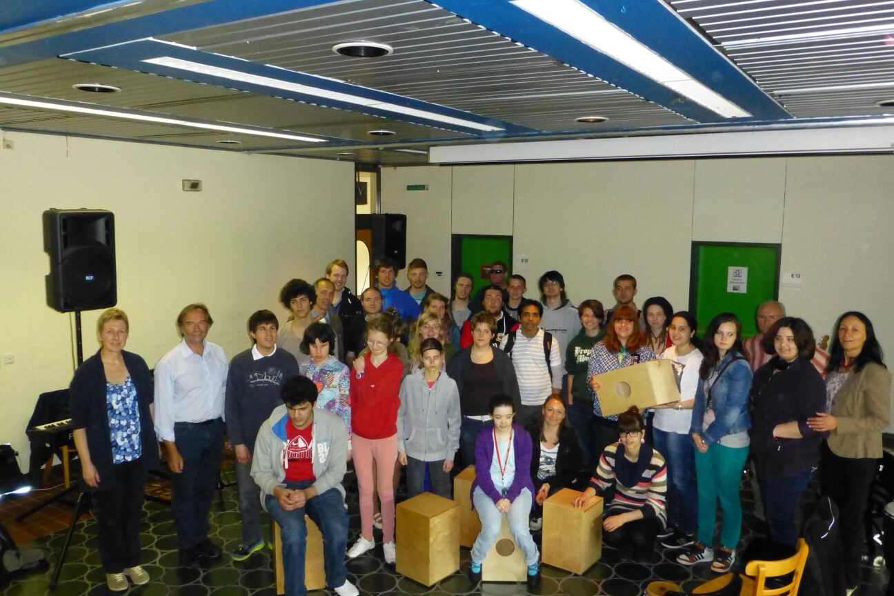 Für das Bildungszentrum für Blinde und Sehbehinderte (bbs) in Nürnberg Langwasser planten und fertigten Schüler des Schreiner-Berufsgrundschuljahres (BGJ) peruanische Klangkisten, sogenannte Cajóns. Im Sinne der Inklusion besuchten sich beide Klassen gegenseitig. Schüler besuchten die Werkräume der B11 und tasteten und fühlten neben den Materialien auch Werkzeuge und Oberflächen. Bei der Lieferung der Cajóns erhielten dann die BGJ-Schüler einen Einblick in den Schulalltag ihrer blinden „Auftraggeber“. Sie lernten das Braille-Alphabet kennen und bewunderten den Umgang mit Computern – ohne dabei den Bildschirm zu verwenden. Zum Abschluss des Projekts musizierten alle Schüler zusammen mit den neuen Cajóns. So selbstbewusst die werdenden Handwerker in ihrer Werkstatt waren, so zurückhaltend wurden sie, als die blinden-Musiker sie zum Spielen mit Klanghölzern, Bongos und anderen Klangwerkzeugen animierten. Doch die Zurückhaltung beim Takt wurde beim mitreißenden Rhythmus schnell vergessen. Die stellvertretende Schulleiterin Frau Gradel und der bbs-Klassenleiter Herr Bielaczek bedankten sich herzlich bei den Praxis-Lehrern der B11 Herrn Perrey und Herrn Falter und ihren Schülern für die gelungenen Instrumente.