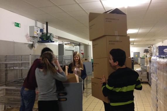 Im Lager haben wir die Produkte für die anstehende Wochenektion vorbereitet. Eine Mitarbeiterin gab uns die vollen Kartons und wir sortierten die Artikel für den Kunden ansprechend in die Schütten. Die ist ganz schön harte Arbeit.