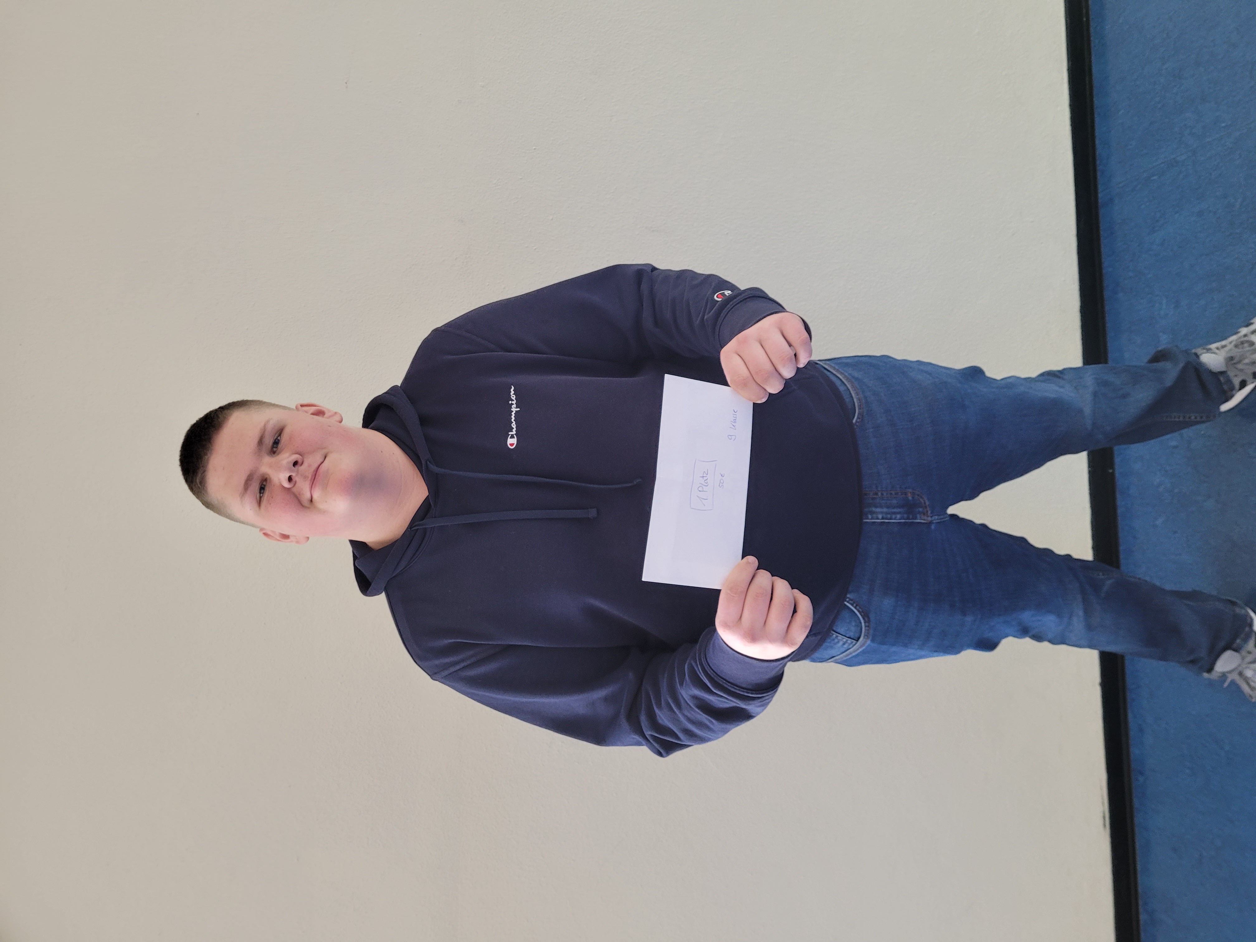 Am Ende konnten sich Nico Zwanzger (D9B) und Alissia Kabakulak (Z10G) durchsetzen und bekamen ihr wohlverdientes Preisgeld in Höhe von 50 Euro. Vielen Dank an dieser Stelle an den Verein der Freunde und Förderer der Städtischen und Staatlichen Wirtschaftsschule Nürnberg, der sich bereit erklärte, dies zu finanzieren. Herzlichen Glückwunsch auch an die weiteren Teilnehmer: Levi Erlenbach (V9D), Noah Lau (V9C), Lilly Moldovan (D9A), Ashot Martirosyan (Z10G), Antonia Föhring (Z10F) und Ronya Civas (Z10H).