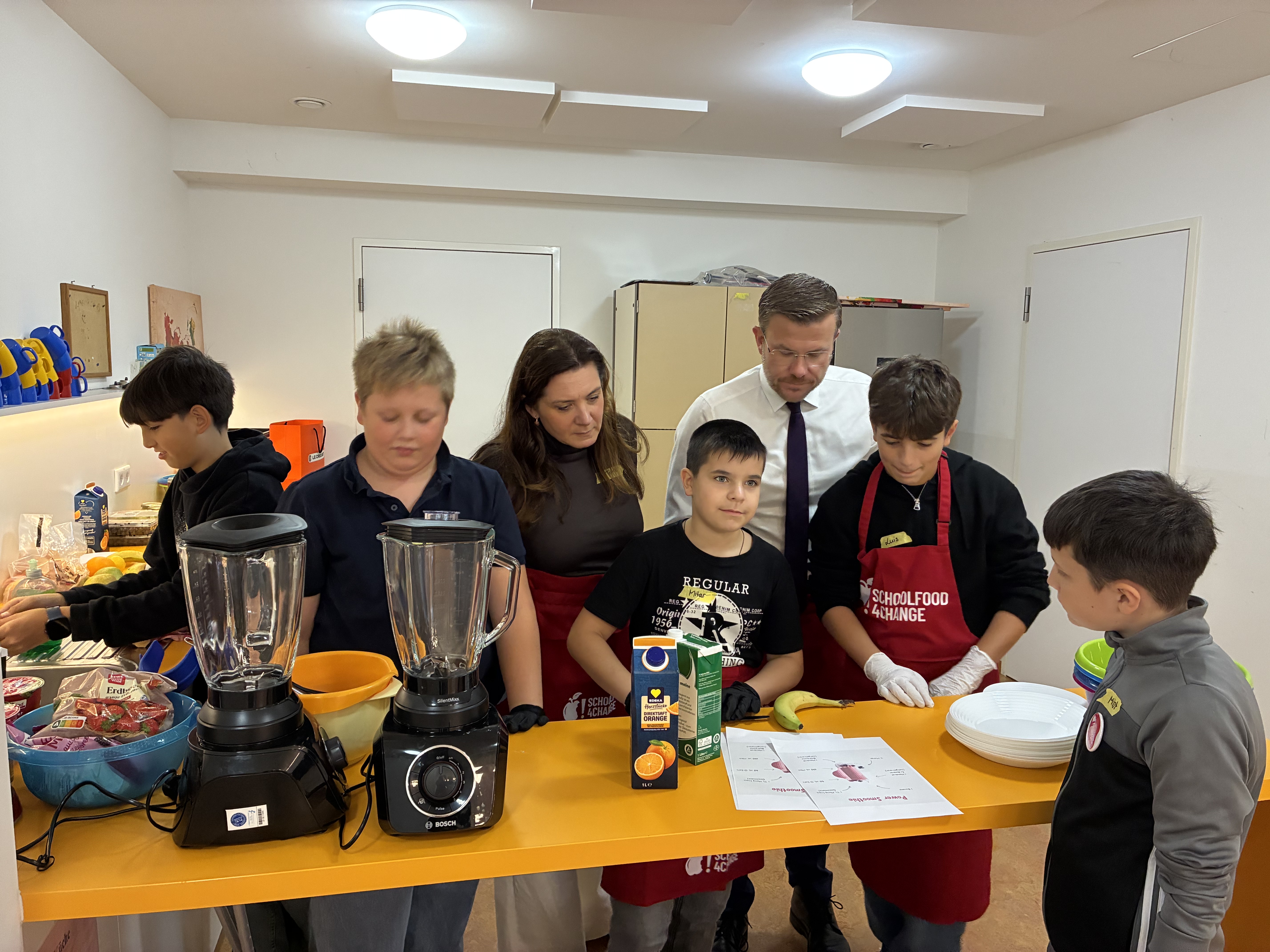 Ein besonderes Ereignis fand an der Städtischen und Staatlichen Wirtschaftsschule Nürnberg statt: Oberbürgermeister Marcus König, die Referentin für Schule und Sport Cornelia Trinkl, der stellvertretende Amtsleiter der beruflichen Schulen Andreas Schwibach sowie Christian Sandner, Nürnberger Koordinator des europaweiten Projekts SchoolFood4Change, kochten gemeinsam mit Schülerinnen und Schülern einer sechsten Klasse unter der Leitung von Frau Theresa Hühnlein in den Ganztagesräumen der Schule.