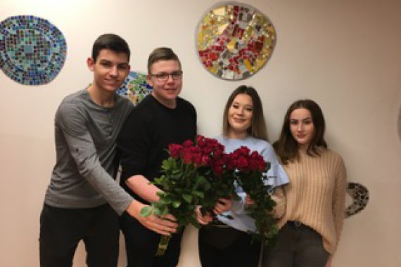 Zahlreiche Schülerinnen und Schüler unserer Schule wollten eine oder auch mehrere Rosen verschenken und strömten deshalb in den Pausen zum Verkaufsstand der SMV. Aber für die engagierten Mitarbeiter auf Schülerseiten war das gar kein Problem. Besonderer Beliebtheit erfreute sich auch wieder die Möglichkeit, Rosen an andere Schulen zu schicken, um dort jemandem den Tag zu versüßen.