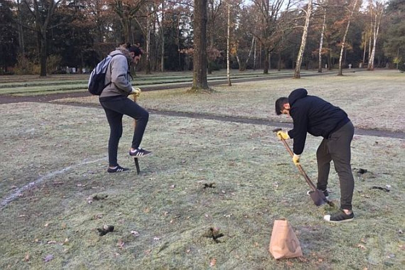 Am 14. November 2017 pflanzten Schülerinnen und Schüler der Klasse V8D und einige Mitschüler der VWS- Klasse 1950 Narzissenzwiebeln auf dem Südfriedhof. 1950 Narzissenzwiebeln – die Zahl steht für die Opfer der Nürnberger Zivilbevölkerung, die am 2. Januar 1945 bei den verheerenden Luftangriffen ums Leben gekommen sind.