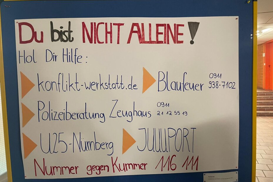 Plakat mit Hilfestellen und Telefonnummern