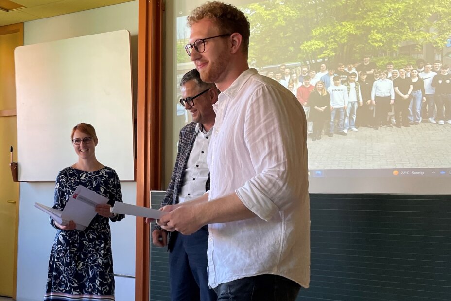 Bei der Übergabe strahlen deshalb Ausbildungsleiter und zukünftiger Chef Wolfgang Braun, Annika Sommer und Lehrer Sven Schauer um die Wette!