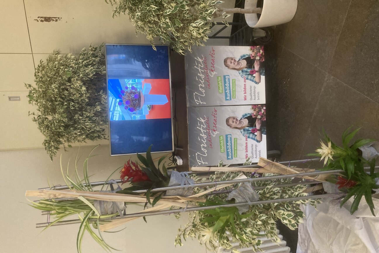 Unsere Auszubildenden fertigten im Unterricht Raumdekorationen, Kränze, Sträuße und Tischdekorationen an. Für den Berufsbasar gestalteten unsere Schüler/-innen damit einen einladenden Stand im Foyer der Wirtschaftsschule und stellten ihre Fachkenntnis überzeugend dar. Um den Stand zu komplettieren, steuerte der Fachverband Deutscher Floristen (FDF) diverses Printmaterial und einen Werbe-Aufsteller bei.