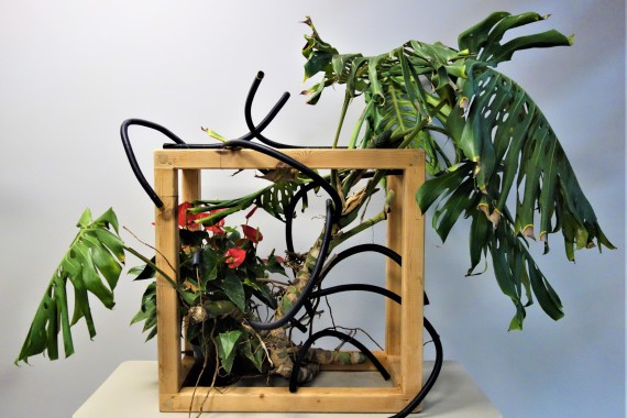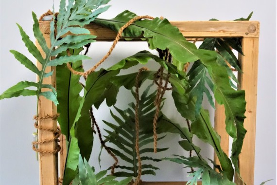 Ausgangspunkt für die Gestaltung sind Holzrahmen mit der Bemaßung 80 cm Höhe auf 80 cm Breite und 40 cm Tiefe. Für die Gestaltung stehen ihnen 3 verschiedene Werkstoffe zur Verfügung. Diese können sowohl floral als auch nicht floral sein. Achten Sie bei der Zusammenstellung der Werkstoffe darauf, dass die tropische Wirkung im Vordergrund steht und die Aussage unterstützt.
