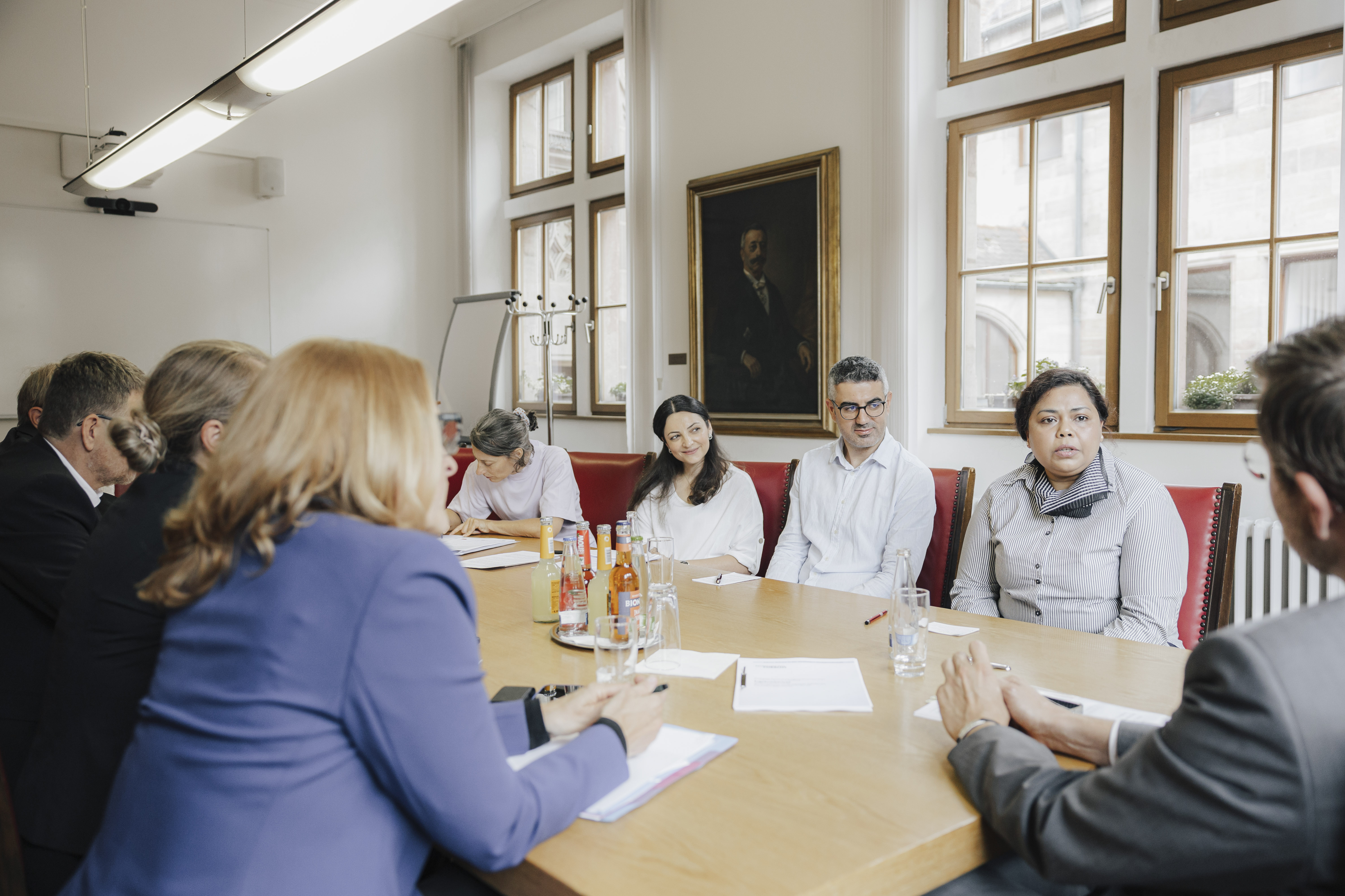 Die dritte Forschungsgruppe von "Nürnberg forscht" befasste sich über mehrere Monate hinweg mit der Frage, wie politische Mitgestaltung von Menschen mit Zuwanderungsgeschichte in Nürnberg gelingt – und wo diese an Grenzen stößt. Die Mitforschenden, die selbst Migrationserfahrung haben, untersuchten dazu lokale Beteiligungsmöglichkeiten: Sie führten Interviews mit Politikerinnen und Politikern, die teils selbst zugewandert sind, und initiierten eine Online-Umfrage unter zugewanderten Menschen in Nürnberg. Die Ergebnisse ihrer Citizen-Science-Studie diskutierten sie in einem Fachgespräch mit Oberbürgermeister Marcus König und Katrin Hirseland, Vizepräsidentin des Bundesamts für Migration und Flüchtlinge (BAMF).