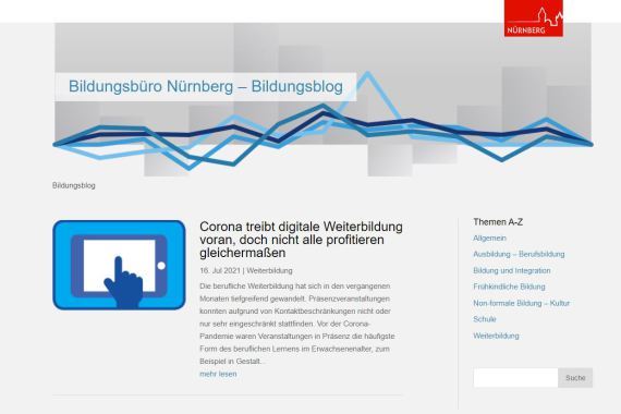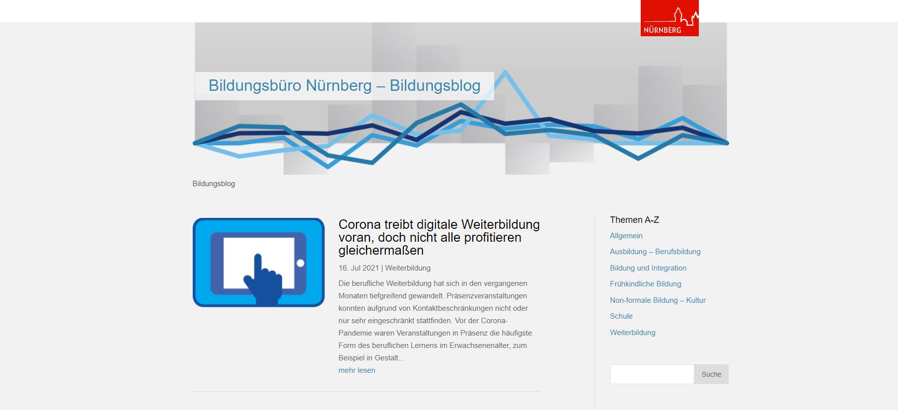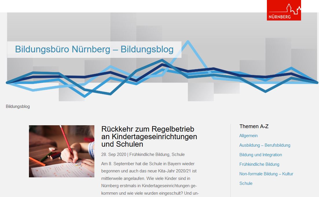 Der Bildungsblog des Bildungsbüros der Stadt Nürnberg ging im Juli 2020 online. Darin stellt das Bildungsbüro in regelmäßigen Abständen aktuelle Befunde, Analysen und Neuigkeiten zu Bildungsthemen in Nürnberg zusammen.