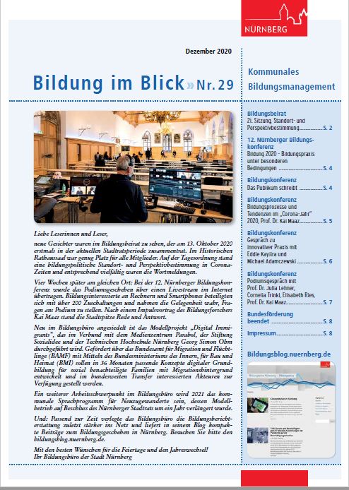 Am 13. November 2020 fand die 12. Nürnberger Bildungskonferenz „Bildung 2020: Bildungspraxis unter besonderen Bedingungen“ statt. Aufgrund der Corona-Pandemie wurde die Konferenz als Online-Veranstaltung durchgeführt und per Livestream aus dem Historischen Rathaussaal übertragen.