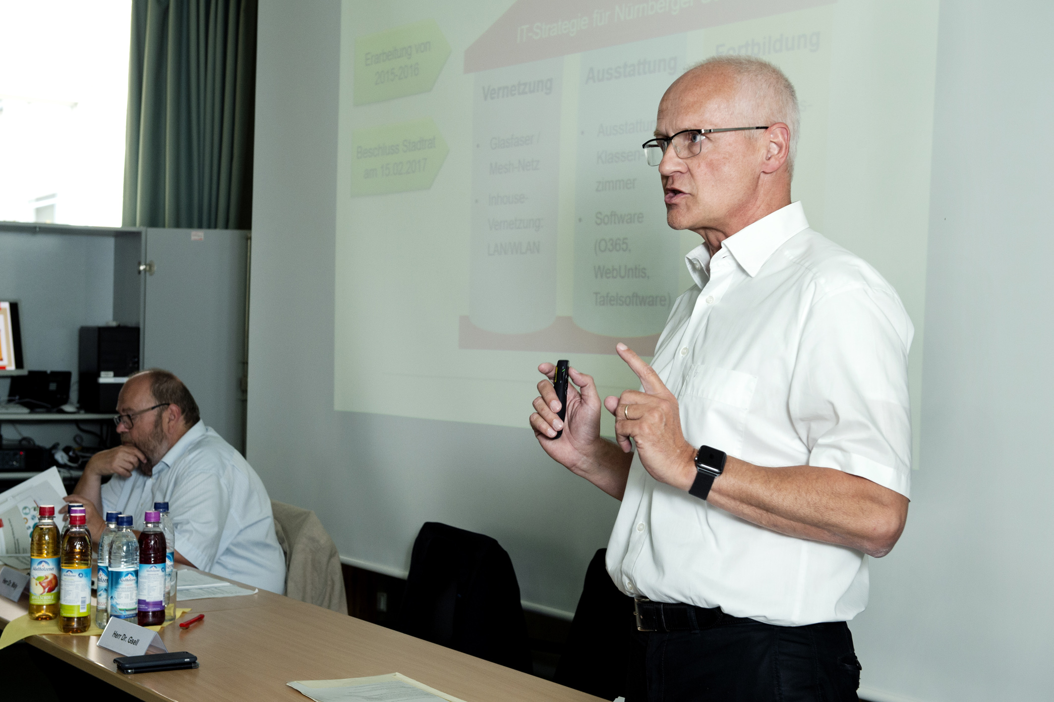 Unter dem Titel „IT-Strategie für Nürnberger Schulen: Lernen und Lehren an städtischen und staatlichen Schulen“ bezog der Leiter des Geschäftsbereichs Schule, Bürgermeister Klemens Gsell, Stellung zur städtischen Politik in Nürnbergs Schulen, für deren Umsetzung neben neugeschaffenen Personalstellen im Zeitraum von 2018 bis 2026 etwa 85,5 Millionen Euro zur Verfügung stehen. Die Strategie baut auf drei Säulen, die für die kommunale Ebene Gestaltungsspielraum bieten: Vernetzung, Ausstattung und Fortbildung der Lehrkräfte. Bei der Vernetzung, die ämter- und dienststellenübergreifend geplant wird, müssen 93 Schulstandorte versorgt werden, so Gsell. Durch bereits existierende Lichtwellenleitungen der Feuerwehr („Feuerwehrnetz“) können ab 2020 pro Jahr 10 bis 12 Schulstandorte effektiv angebunden, und auch mit Hard- und Software versorgt werden. Gsell betonte, dass beim Umgang mit Software Fragen rund um den Datenschutz zu beachten sind und die Komplexität des Handelns erhöhen. Bei der Fortbildung der Lehrkräfte arbeitet das städtische Institut für Pädagogik und Schulpsychologie Nürnberg (IPSN) mit der Akademie für Lehrerfortbildung und Personalführung (ALP) in Dillingen zusammen.