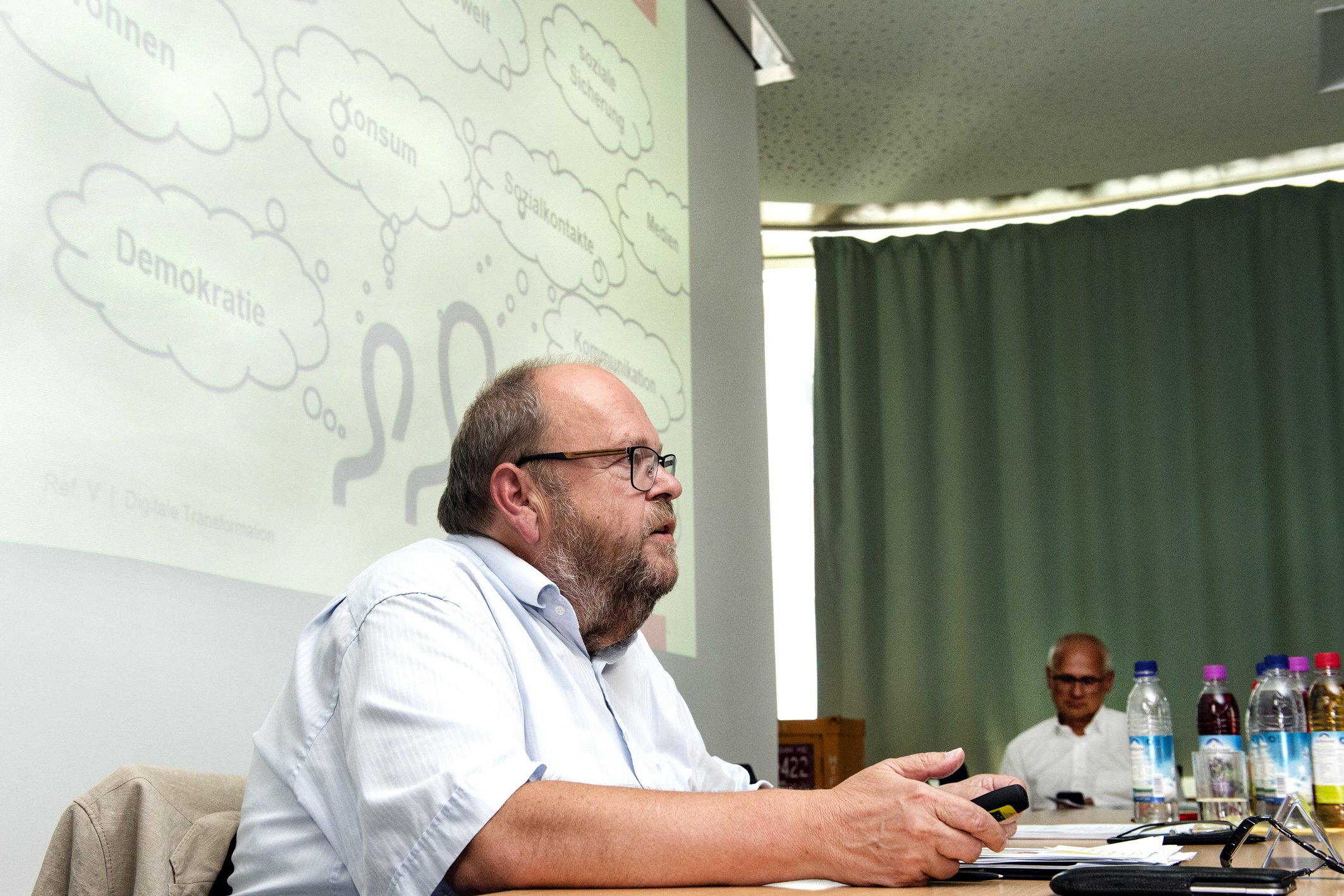 Zum Beginn seines Beitrags betonte Sozialreferent Reiner Prölß anhand von Beispielen einleitend, dass die digitale Transformation alle Menschen in allen Lebensbereichen betreffe: Herausforderungen, zum Beispiel neue Formen der Ausgrenzung wie dem „digital divide“, stünden Chancen und Möglichkeiten gegenüber, unsere Arbeit effektiver, und auch angenehmer zu gestalten.