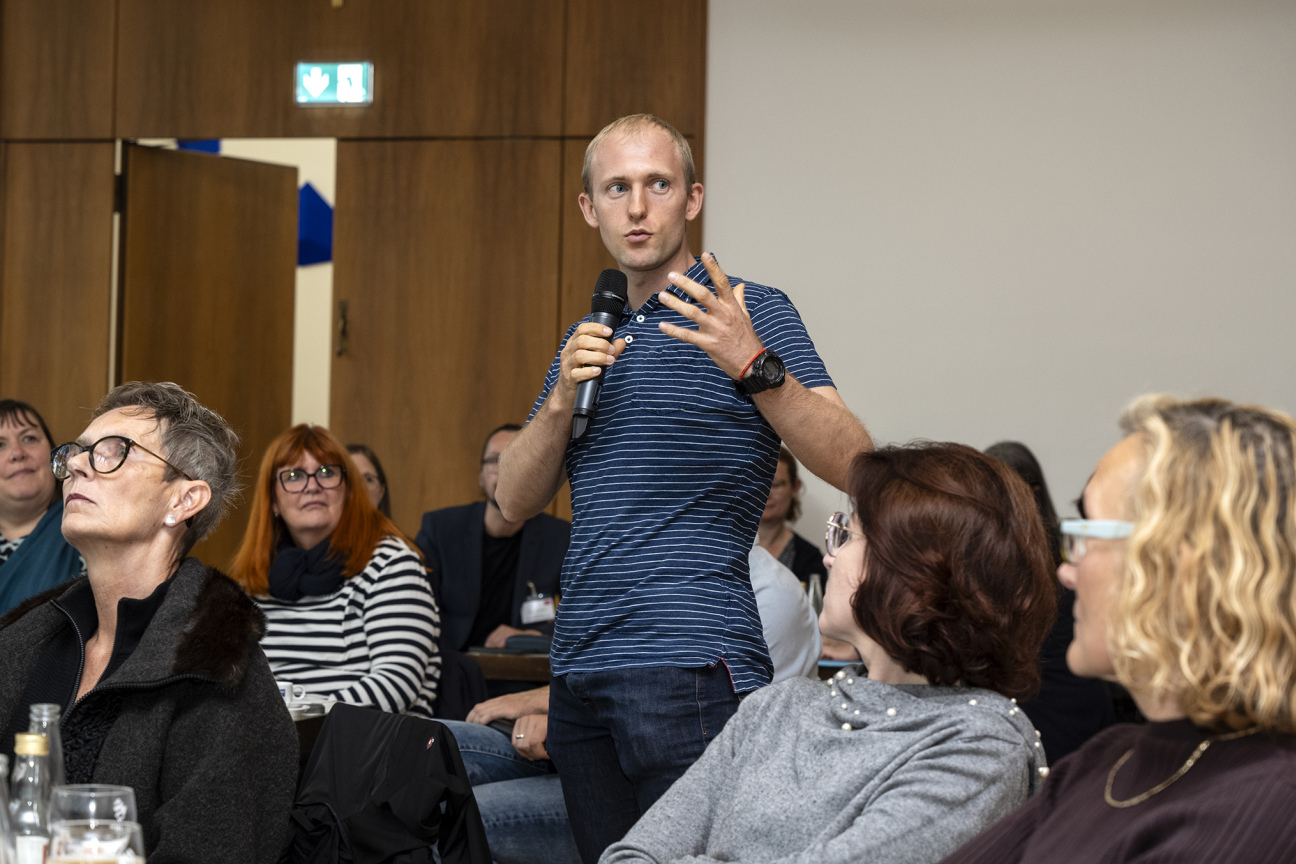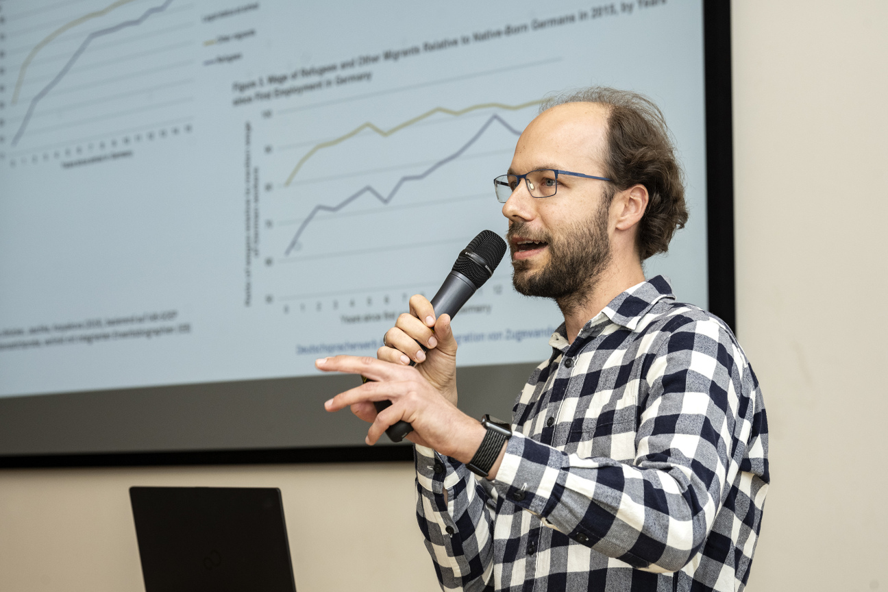 Philipp Jaschke vom Institut für Arbeitsmarkt und Berufsforschung (IAB) stellte kompakt die Zusammenhänge von Sprachbildung und Arbeitsmarktintegration von Zugewanderten dar, wie sie aus Daten-Analysen des IAB valide abgleitet werden können. Er sieht vor allem in der Zeitdauer bis zum Beginn des ersten Sprachkurses (Integrationskurs) deutlichen Verbesserungsbedarf und weist auf das hohe Potenzial von geflüchteten Frauen hin, das durch passende Angebote zur Kinderbetreuung während der Deutschsprachangebote besser gehoben werden könnte. Insbesondere diese Zielgruppe hätte auch kaum Möglichkeiten die Sprache parallel zu einer Erwerbstätigkeit zu lernen.