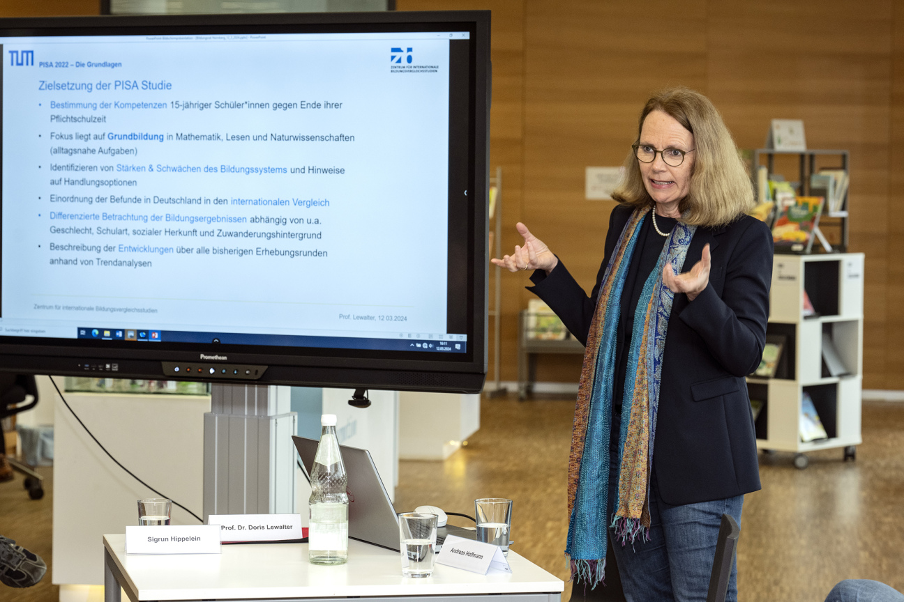Im Anschluss stellte Prof. Dr. Doris Lewalter zentrale Ergebnisse der internationalen PISA-Studie 2022 für Deutschland im OECD-Ländervergleich vor. Die Kompetenzen der 15-Jährigen in Mathematik, Lesen und Naturwissenschaften hätten gegenüber 2018 deutlich abgenommen. Schülerinnen und Schüler in Deutschland lägen in Mathematik und Lesen im OECD-Schnitt und nicht mehr darüber, was nur mehr auf Naturwissenschaften zuträfe. Die Gruppen der leistungsschwachen Schülerinnen und Schüler seien in allen drei Bereichen deutlich gewachsen und diese damit nicht ausreichend auf eine erfolgreiche Teilhabe in der modernen Gesellschaft und den Berufseinstieg vorbereitet. In ihren Empfehlungen verwies Prof. Dr. Doris Lewalter auf eine bedarfsorientierte Ressourcenzuwendung und nannte als Beispiel das Startchancenprogramm des Bundes. Sie empfahl eine Sprachbildung während der gesamten Schullaufbahn. Digitale Medien und Methoden könnten nach Bedarf helfen, auch differenziert zu unterstützen.
