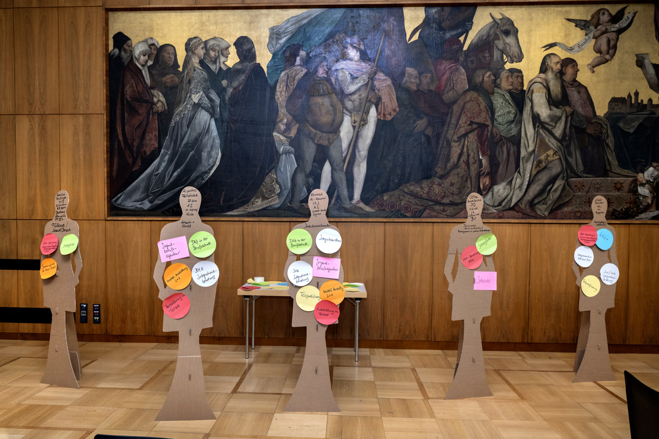 Mit Blick auf die Bedarfe der Zielgruppen, die im Raum durch fünf typisierte Darstellungen, sogenannte Personas, vertreten waren, erläuterten die Referentin für Schule und Sport Cornelia Trinkl sowie die Referentin für Jugend, Familie und Soziales, Elisabeth Ries die in der Stadt bestehenden Angebote zur Verknüpfung sprachlichen Lernens und beruflicher Entwicklung.