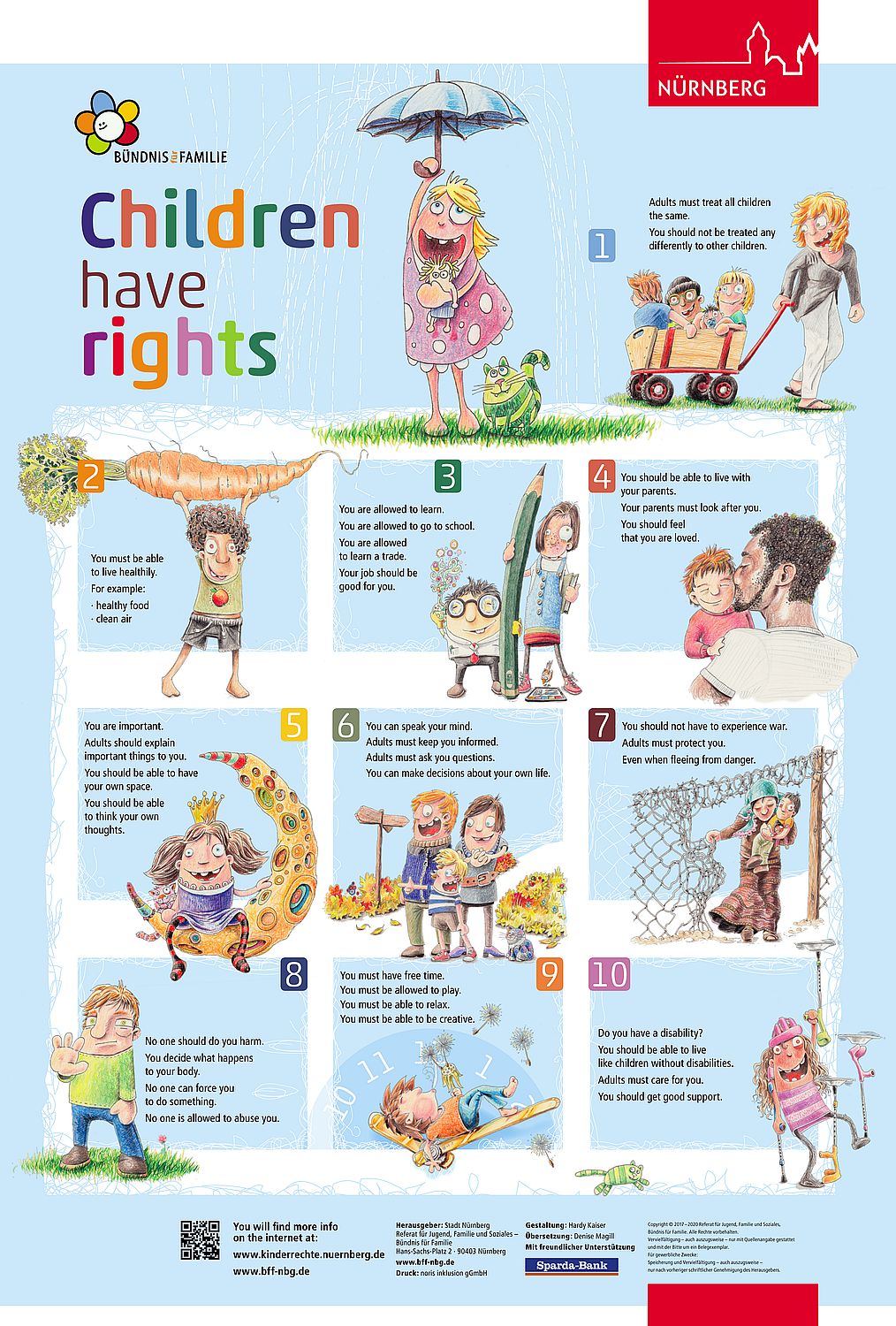 Nürnberg trägt als "Stadt der Menschenrechte" in verschiedenen Feldern aktiv dazu bei, die Rechte der Kinder zu kennen, zu verstehen, zu verteidigen und zu respektieren. Die Etablierung der Kinderkommission und regelmäßiger Kinderversammlungen sind hier ebenso zu nennen wie die Entwicklung der "Straße der Kinderrechte" im Stadtpark und vielfältige Veranstaltungsformate für Kinder, Jugendliche und Erwachsene.