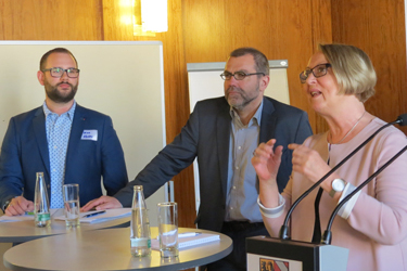 Harald Riedel (städtischer Personalreferent) und Fabian Körber (GPR-Vorsitzender und junger Vater) diskutierten im Anschluss gemeinsam mit Kirsten Frohnert über das Thema "Väter bei der Stadt Nürnberg".