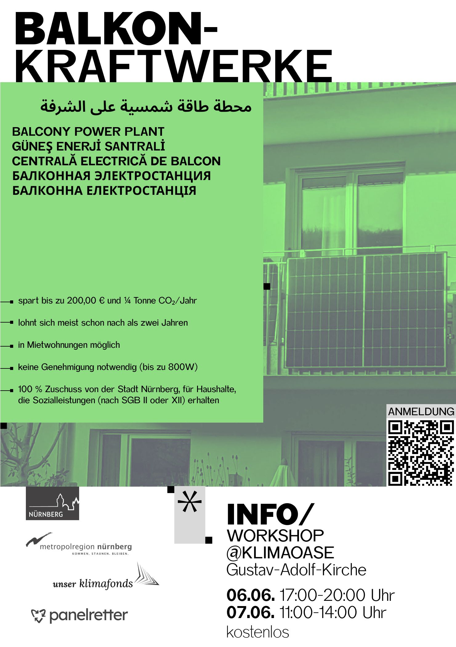 Gemeinsam mit Urban Lab und den Panel Rettern veranstalten wir am 06.06.2025 und am 07.06.2025 einen Workshop zum Thema Balkonkraftwerke. Weitere Informationen sind unter dem Link zu finden