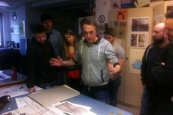 Das war nur ein Beispiel der vielen Aufträge des Siebdruckkünstlers, in dessen Arbeiten und Arbeitsweisen die Fachschüler des 1. Jahrgangs einen kleinen Einblick erhielten. Der Autodidakt Michely, der seit 1989 professionell Siebdruck betreibt, beschrieb in interessanter, lebendiger Art und Weise seinen Werdegang vom Streetworker zu einem der bekanntesten Kunstsiebdrucker Deutschlands, der aber auch internationale Aufträge bekommt. Die angehenden Techniker und Technikerinnen waren begeistert von den doch zahlreichen Möglichkeiten, die der Siebdruck bietet. Vielen Dank für die interessanten Einblicke.