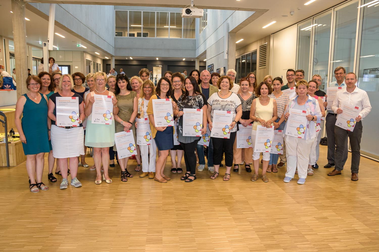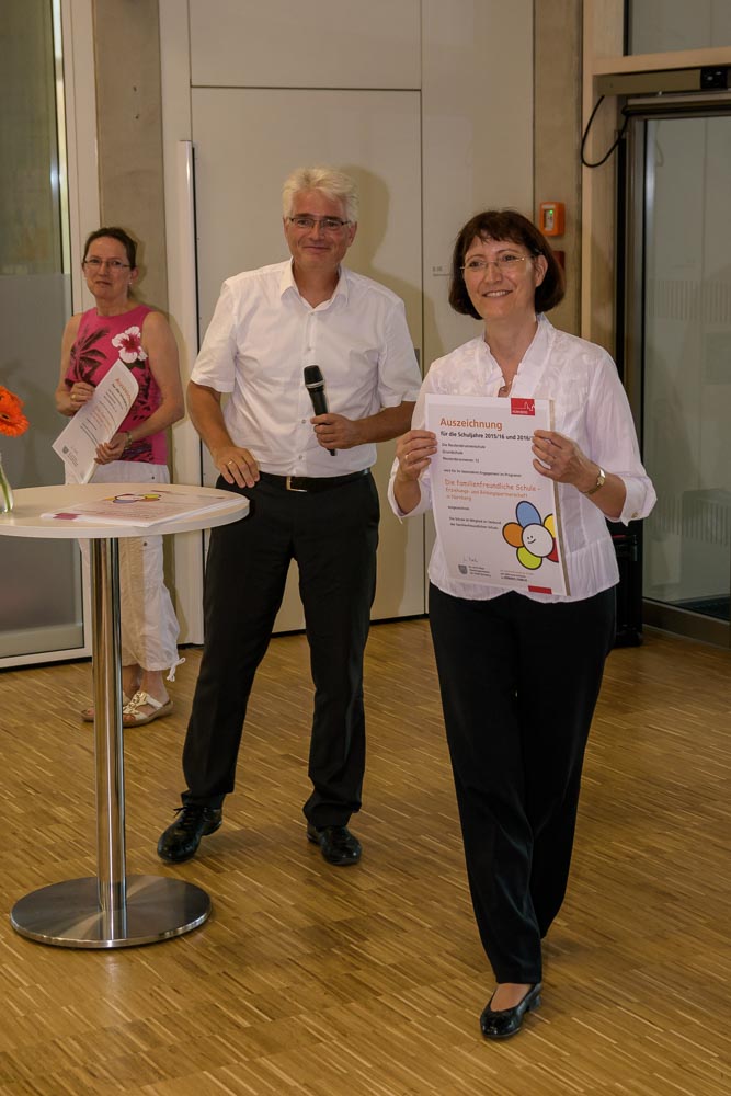 Für die Schuljahre 2015/16 und 2016/17 wurden 20 Grund-, 8 Mittelschulen und ein Förderzentrum für ihre gelungene Umsetzung einer Erziehungs- und Bildungspartnerschaft ausgezeichnet. Die Auszeichnungen wurden durch Dr. Kerstin Schröder, Amt für Kinder, Jugendliche und Familien – Jugendamt, Amtsleitung und Stefan Kuen, fachlicher Leiter des Staatlichen Schulamts in der Stadt Nürnberg verliehen.