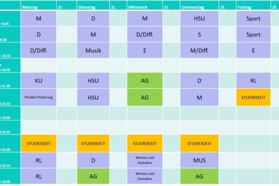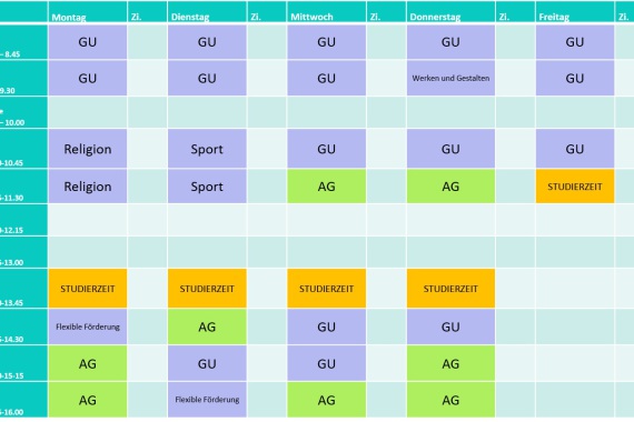 Die Studierzeit ersetzt die Hausaufgaben und dient der individuellen Förderung. Sie kann sowohl zur Nach- als auch zur Vorbereitung des Unterrichts herangezogen werden. In den Jahrgangsstufen 3 und 4 ist eine längere Betreuung bei Bedarf möglich. Studierzeitpläne und Logbücher sorgen für Transparenz.