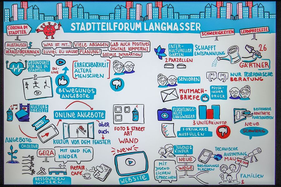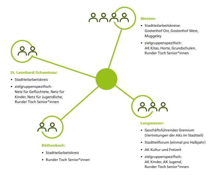 Der Projektname „Gesundheit für alle im Stadtteil“ war gleichzeitig das Ziel: Kommunale Maßnahmen und Angebote der Gesundheitsförderung und Prävention sollen dort angesiedelt sein, wo die Nürnberger Stadtteilbewohner*innen spielen, lernen, wohnen und lieben, also in ihrem unmittelbaren Wohnumfeld. Nach einer Bedarfserhebung zu Beginn des Projekts in Form von Expert*innen-Interviews sowie Diskussionen in den Netzwerken und mit Bewohner*innen-Gruppen wurden die Ergebnisse in die Stadtteilgremien zurückgespielt und flossen in die koordinierte Maßnahmenplanung ein.