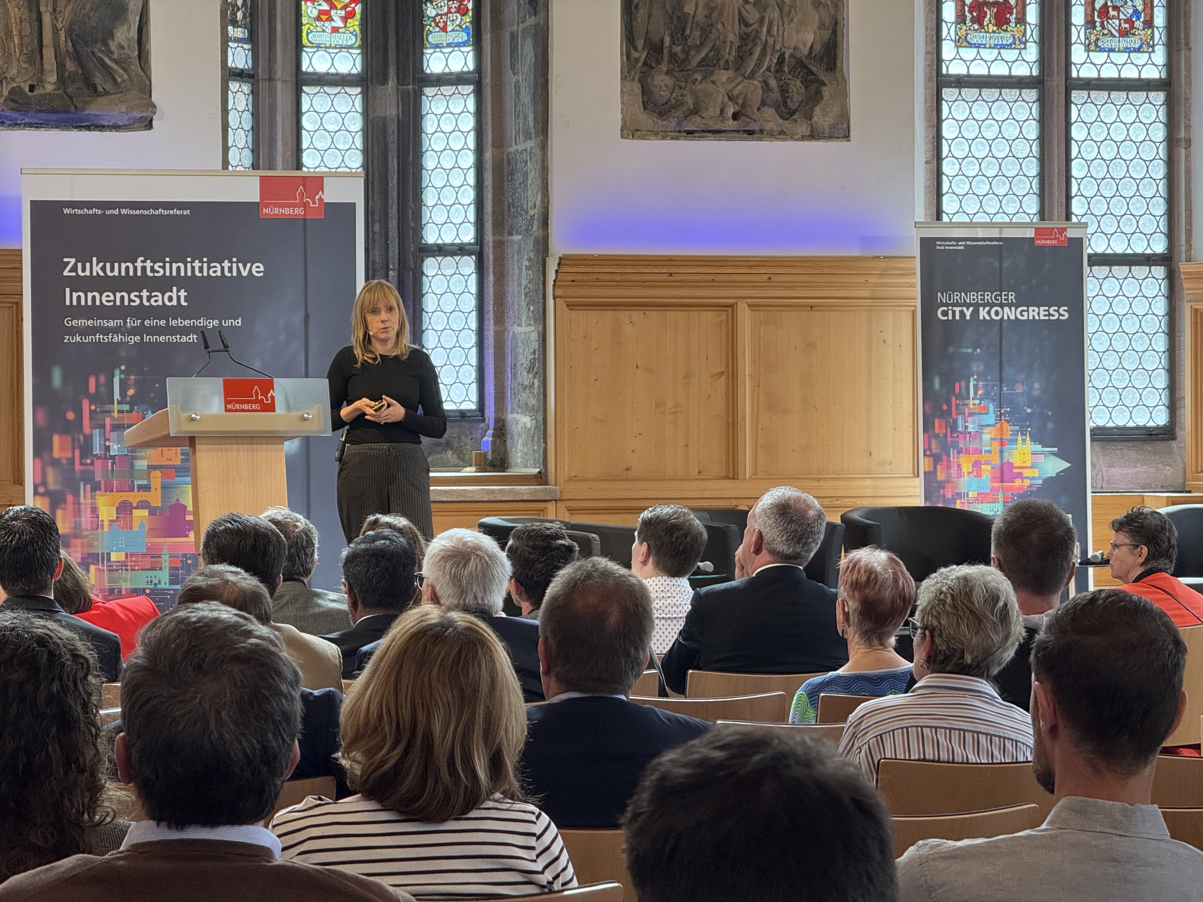 Die renommierte Handels-Zukunftsforscherin Theresa Schleicher gab in ihrem Vortrag wertvolle Einblicke in die aktuellen Trends und Herausforderungen des stationären Einzelhandels und zeigte auf, wie Innenstädte sich zukunftsfähig aufstellen können. „Die Innenstadt Nürnbergs bleibt ein Zentrum der lokalen Lebenskultur. Und diese spiegelt abwechslungsreiches Einkaufen genauso wider wie beliebte Gastronomie, Alltag, Geschichte und Gemeinschaft“, betonte Schleicher. Ihre Thesen stießen auf großes Interesse und lieferten wichtige Denkanstöße für die weitere strategische Arbeit an der Innenstadtentwicklung.
