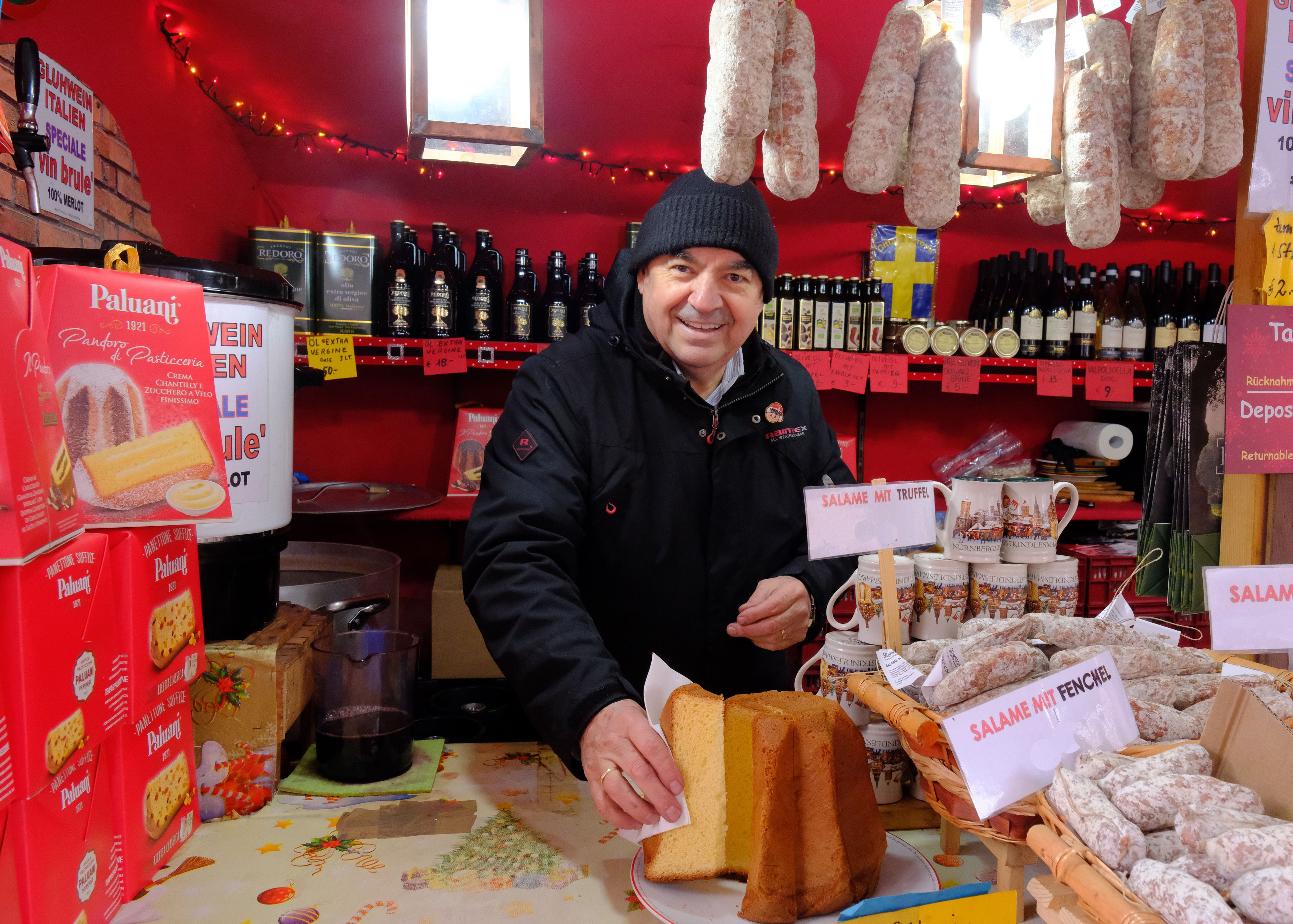 „Formaggi" und natürlich „Salame“ in verschiedenen Geschmacksrichtungen, darunter „Salame Felino“ oder Wildschweinsalami sowie Öle aus Italien sind ebenfalls an der Bude erhältlich.