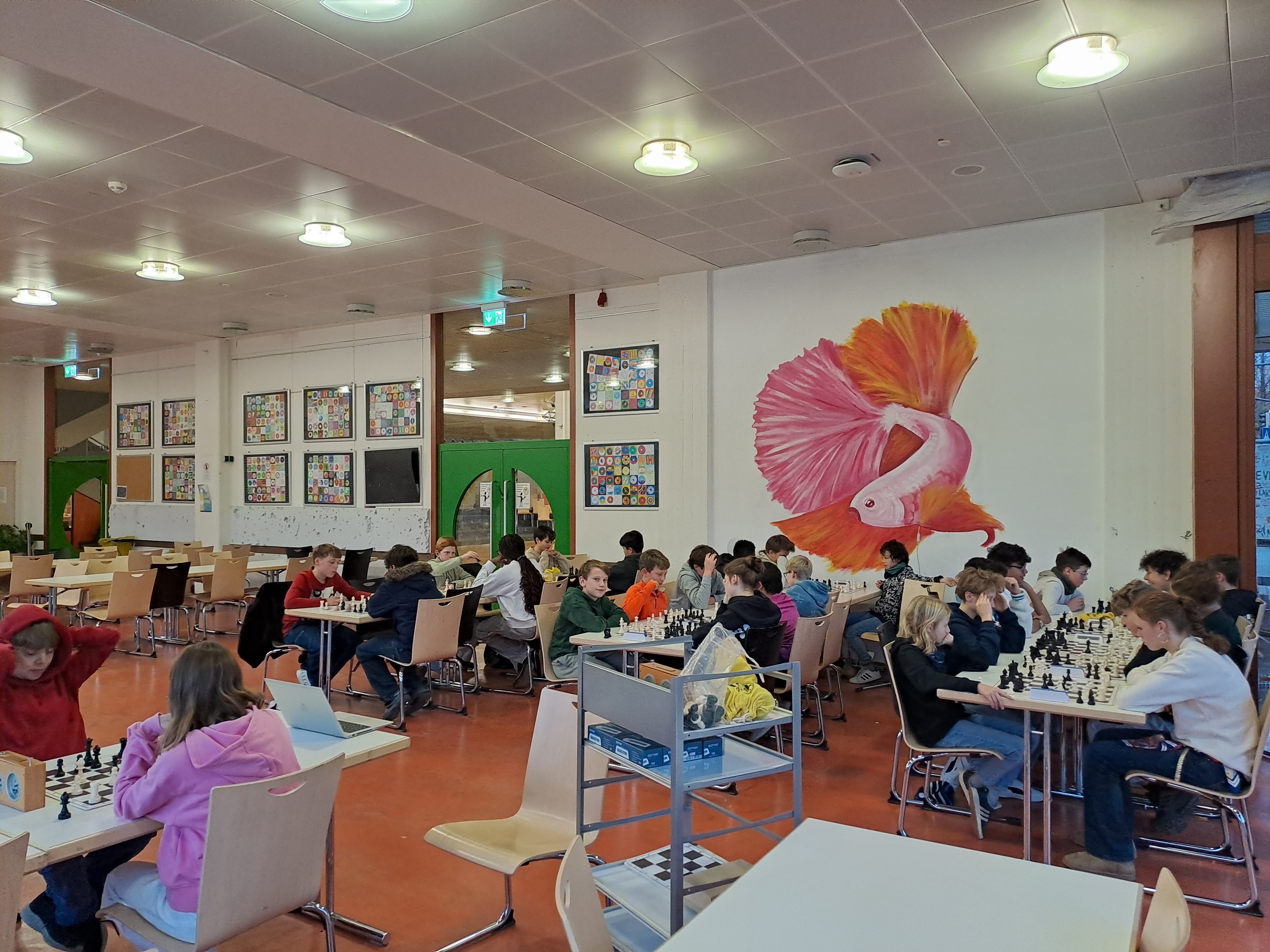 Auch im Schuljahr 2025/26 haben wir wieder die besten Schachspieler und Schachspielerinnen am JSG gesucht. Am Tag vor dem Buß- und Bettag fanden sich 26 Schachbegeisterte (ein neuer Rekord!) aus den Jahrgangsstufen 5-12 in der Mensa ein, um über 7 Runden hinweg sich gegenseitig herauszufordern. Beim Schweizer System werden immer Paarungen gebildet, so dass man gegen andere spielt, die im Turnierverlauf eine ähnliche Bilanz aufweisen. Von 14h bis 17h wurden eifrig Figuren gezogen, Uhren gedrückt, Schach geboten und alle hatten sichtlich Freude sich in einem fairen und spannenden Wettkampf zu messen. An der Spitze des Feldes schlug Jakob Liebel, 9a, in der 3. Runde Jan Urbanke, 9e. Dies sollte sich im Nachhinein als Vorentscheidung erweisen, denn es war die Partie des späteren Siegers gegen den Zweiten. In Runde 6 sollte Jakob zwar noch Federn lassen, indem er gegen Luka Lempa, 6b, remis spielte, aber dies blieb der einzige Punktverlust für ihn. Da Jan Luka schon in Runde 2 geschlagen hatte, war somit die Reihenfolge der ersten drei letztendlich klar, auch wenn natürlich jeder der Nachfolgenden noch auf einen Punkteverlust des Führungstrios hoffte. Aber dem war nicht so und so gewann letztendlich Jakob Liebel, 9a, souverän mit 6,5 Punkten aus 7 Partien gefolgt von Jan Urbanke, 9e, mit starken 6 Punkten und Luka Lempa, 6b, mit 5,5 Punkten vor einem weiteren Trio mit jeweils 5 Punkten. Bestes Mädchen wurde Jule Sauermann, 9f, mit 4 Punkten und bester Fünftklässler Niado Uruci, 5e, mit 3 Punkten. Ein sehr erfreulicher Aspekt war, dass alle teilnehmenden mindestens einen Punkt holen konnten.