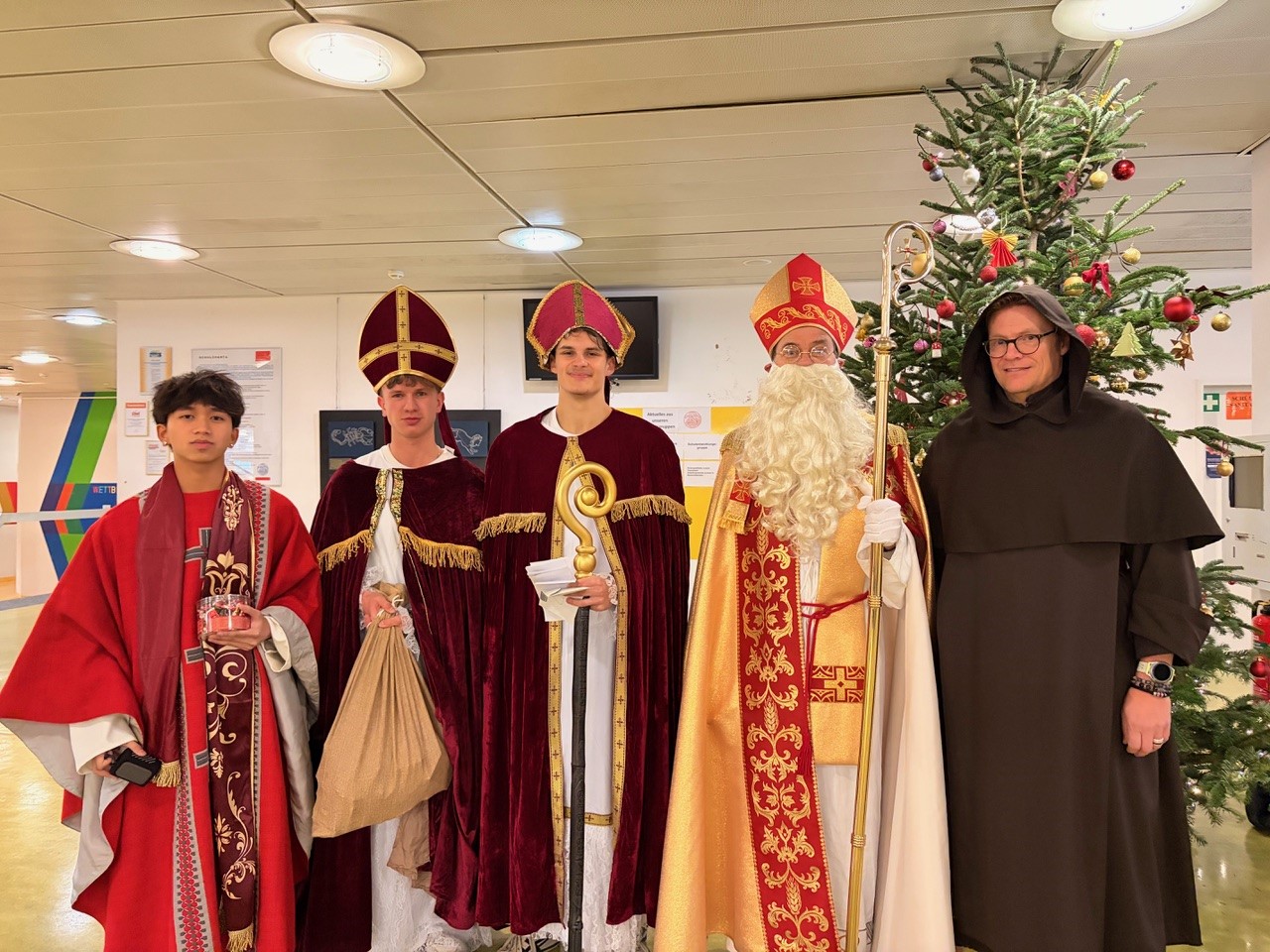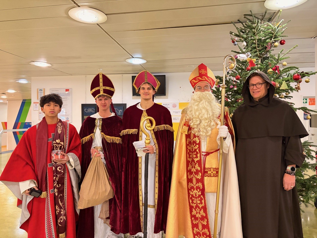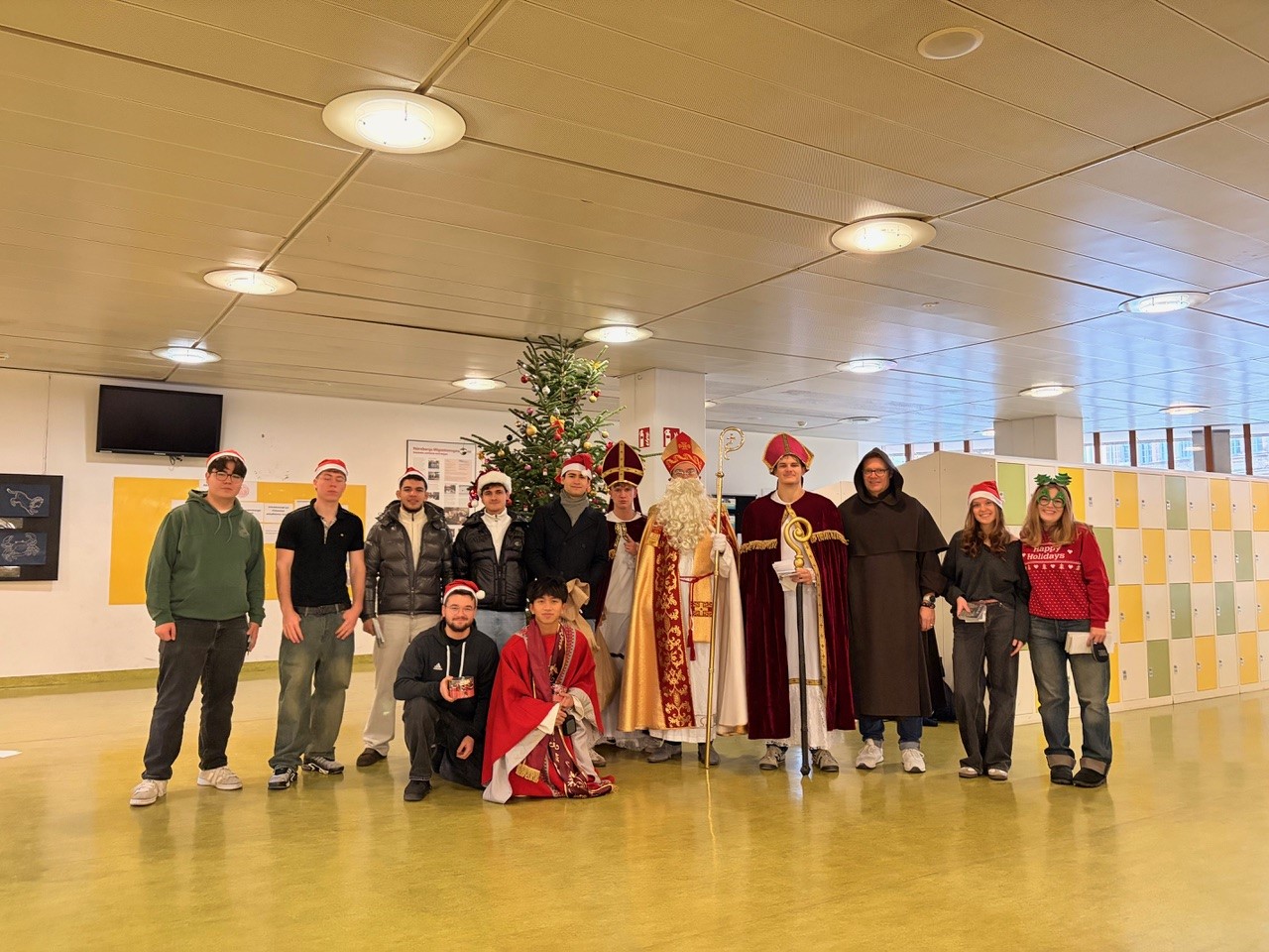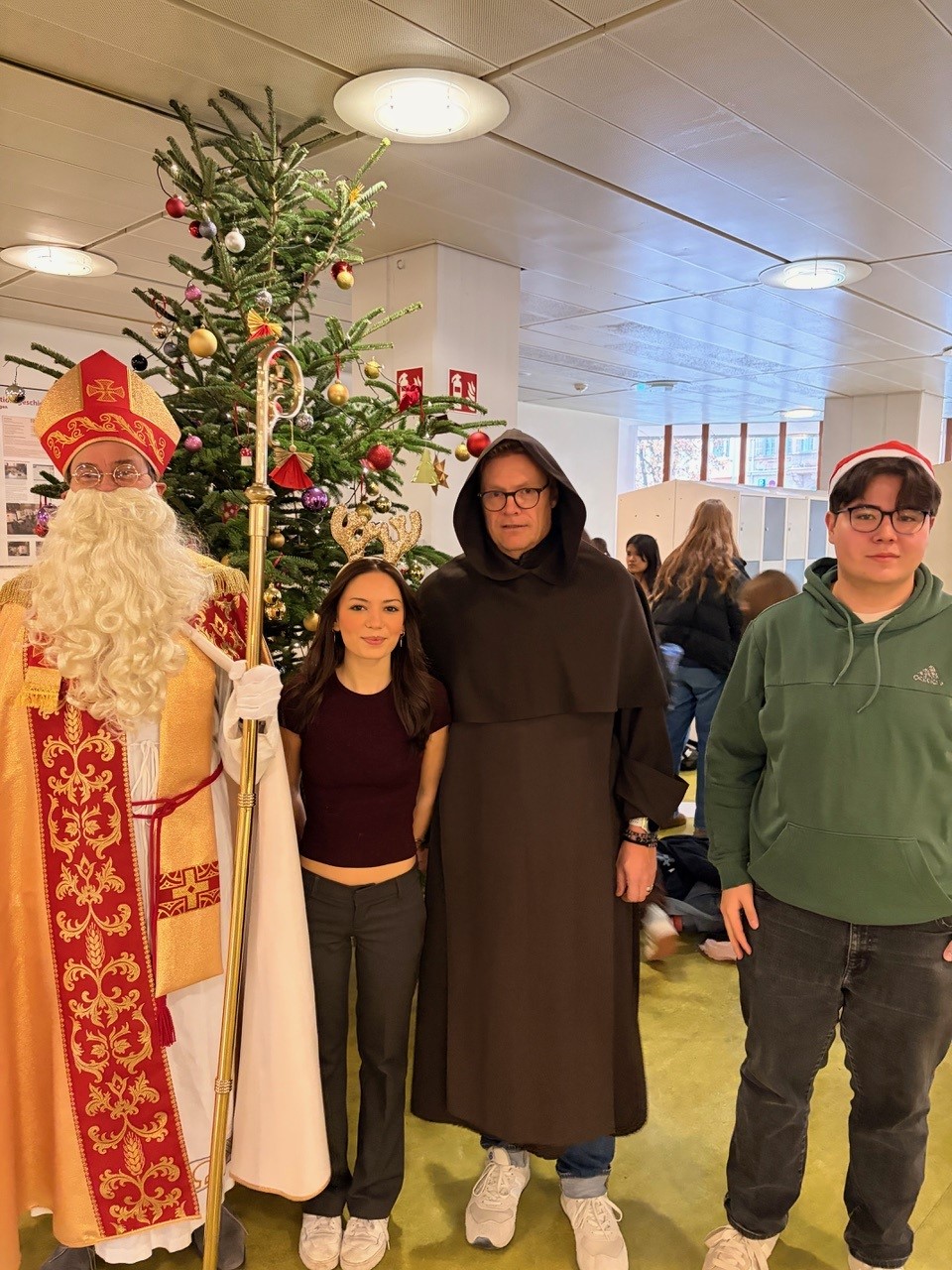 Jeder Schüler und jede Schülerin bekamen heute eine Weihnachtskarte und einen kleinen Fair-Trade-Nikolaus von der SMV, in den 5. Klassen waren auch der Nikolaus und sein Knecht Ruprecht dabei.