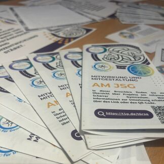 Schülerinnen unseres „Radi-Jo“ von Sven Breivogel zeigten in ihrem unterhaltsamen Bühnenbeitrag den Weg eines Sendebeitrages von der Auswahl eines Themas in der Redaktionskonferenz über Auf-nahme, Schnitt bis zur Sendung und ernteten hierfür viel Applaus. Auf dem anschließenden Markt der Möglichkeiten in der Ehrenhalle informierten Lehrkräfte sowie Schülerinnen und Schüler unserer Schule über verschiedene Möglichkeiten der Mitwirkung und Mitgestaltung am JSG. Maximilian Saam und sein Arbeitskreis „Demokratie bewegt“ beantworteten Fragen zum Schüler-Feedbackkasten „Scharrer 2.0“. Die Schülerinnen und Schüler des Wahlkurses „Gesunde Schule“ zeigten mit den Be-wegungskisten und der Toolbox „Take what you need!“ konkrete Ergebnisse einer Schulentwick-lungsprozesses von und für Lernende, die im Design-Thinking-Ansatz entstanden sind. Sabine Leh-meyer, Leiterin des Lerncoachings am JSG, begleitet und unterstützt die Toolbox als Expertin inhaltlich und fachlich. Auch an diesem Abend ließ sie es sich nicht nehmen, unsere Schülerinnen und Schülern an diesem Abend vor Ort zu unterstützen.