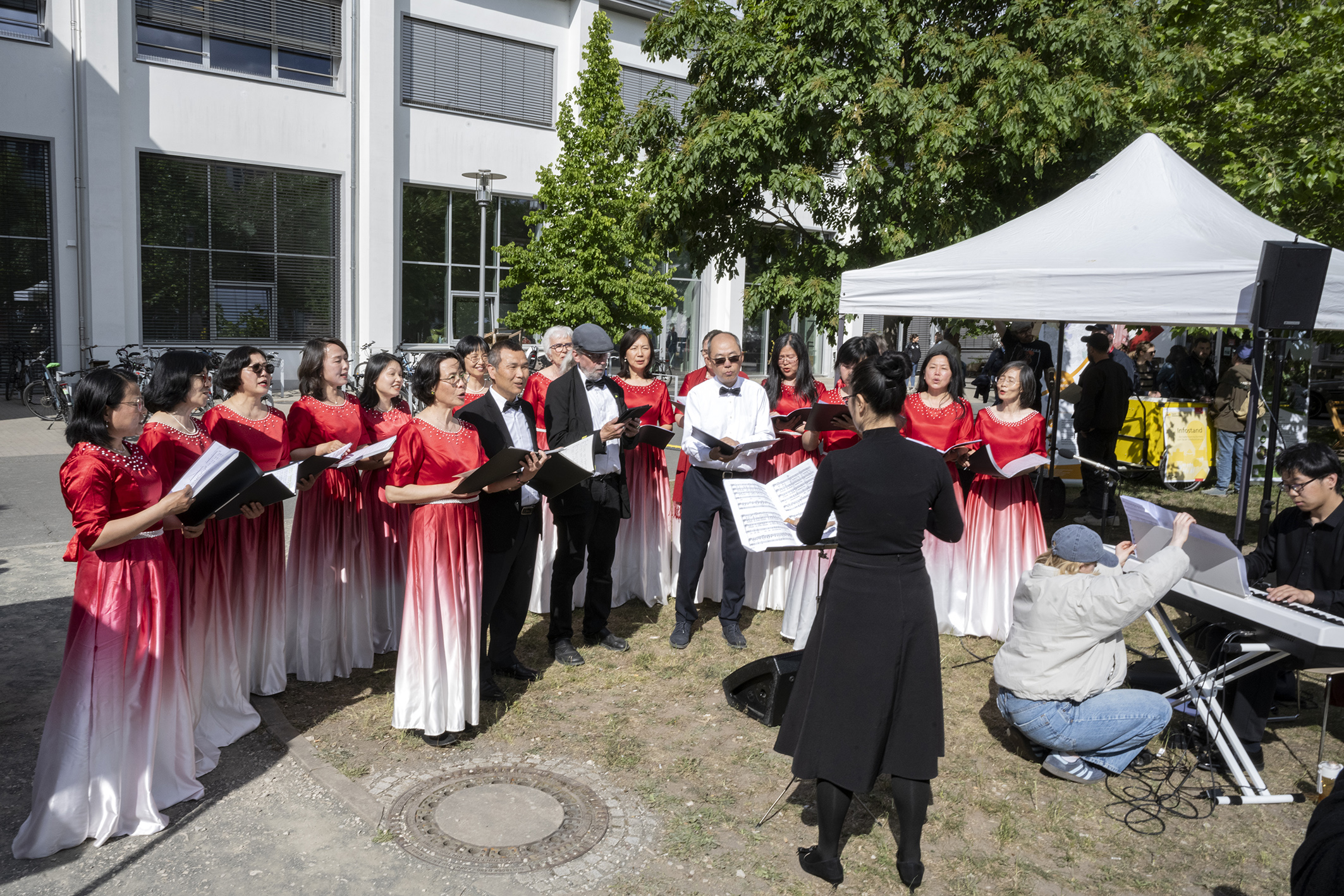 Parallel dazu lief ein schickes Bühnenprogramm: Akkordeon-Spieler und chinesischer Chor wechselten sich ab mit ukrainischer Theater-Performance, rumänischem Kreistanz und einem Musik-Jam.