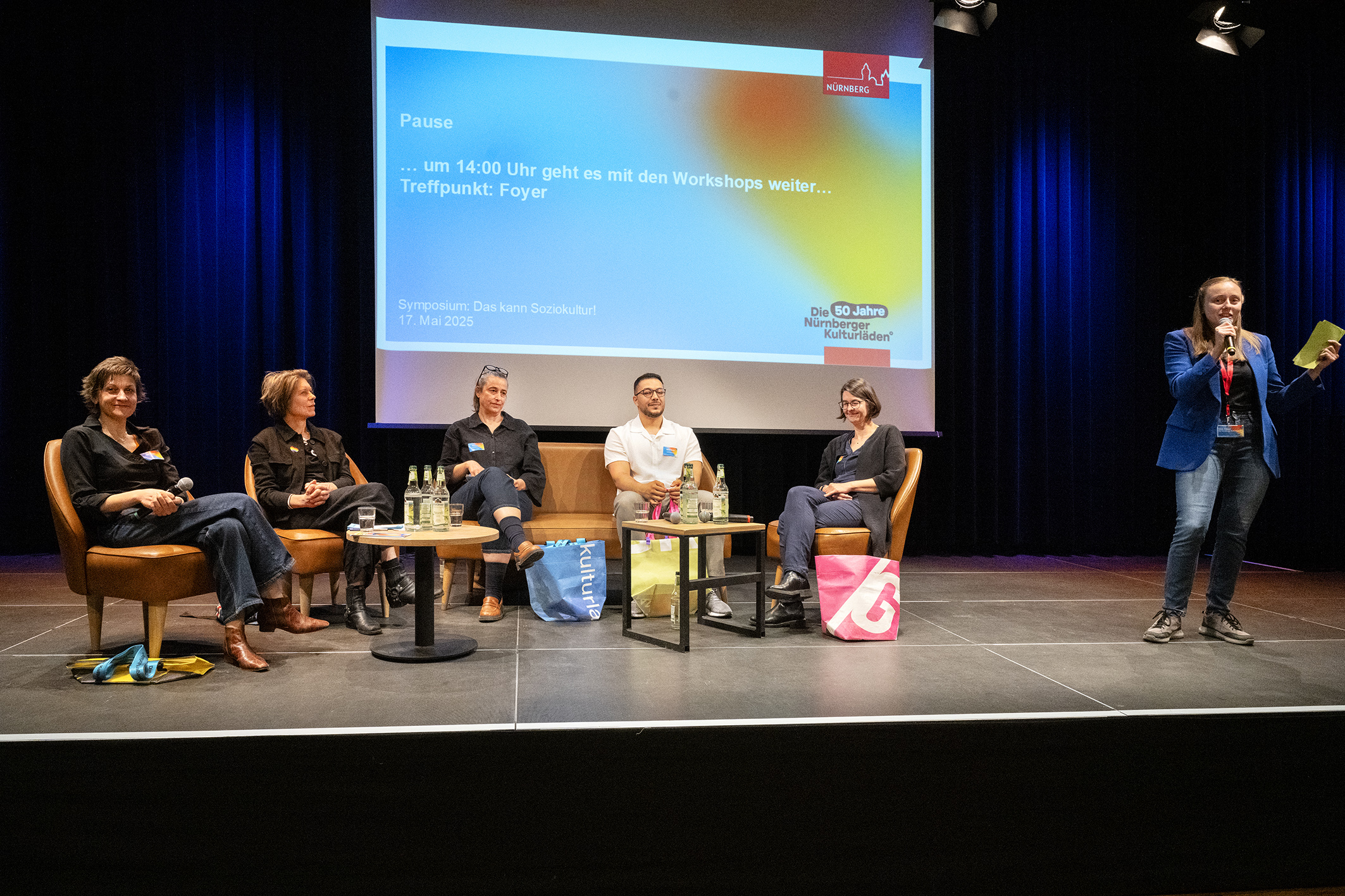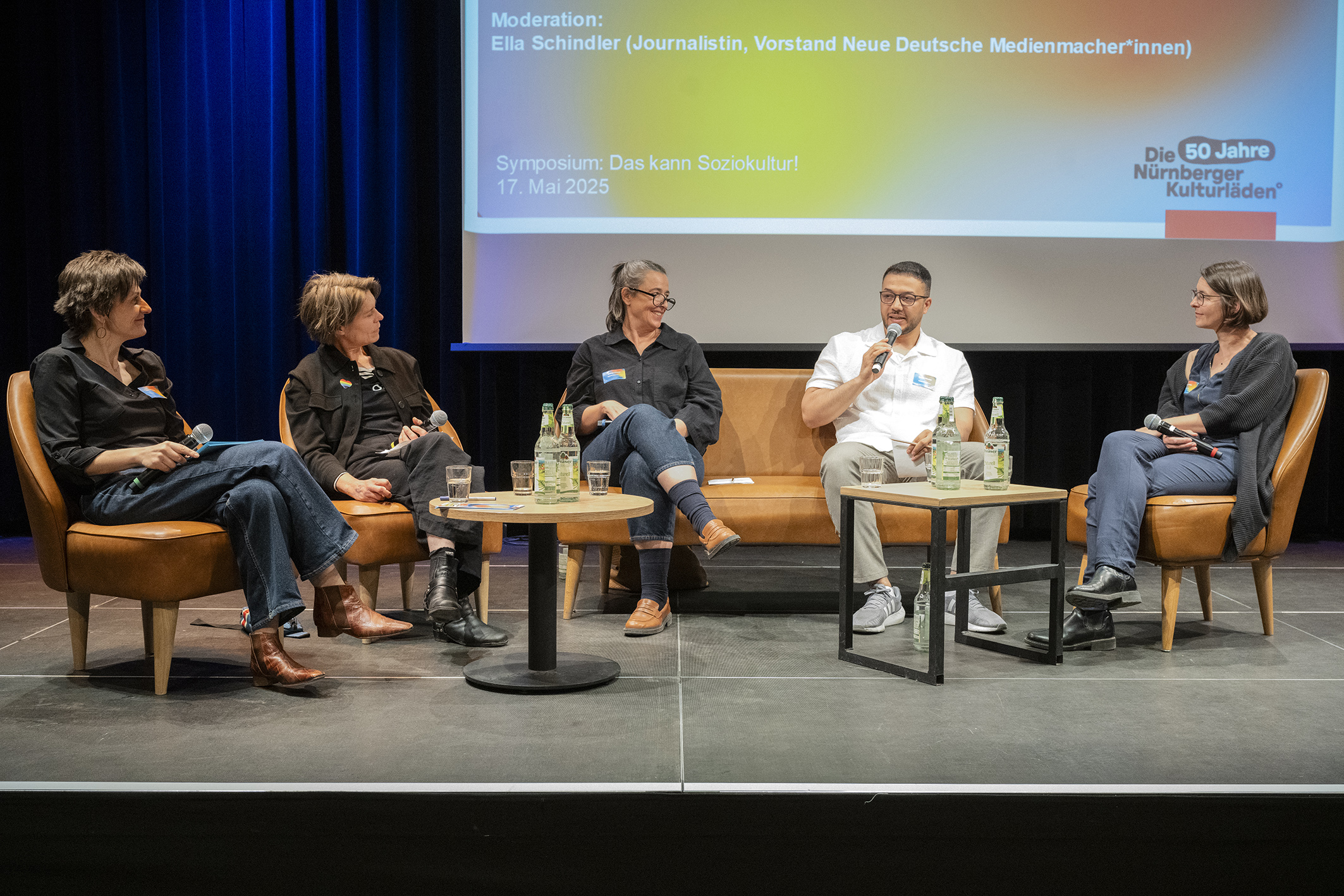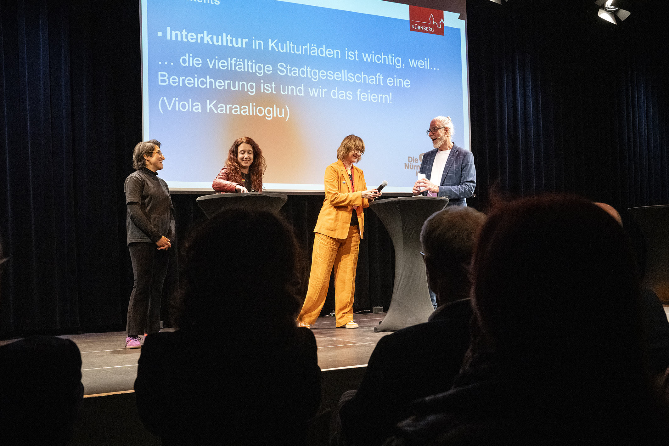 Auf dem Podium: Annette Trümper, Leiterin der Nürnberger Kulturläden°, Amt für Kultur und Friezeit der Stadt Nürnberg; Sabine Limmer, Stadtteilzentrum Desi e.V.; Sorush Mawlahi, Vorstand des Integrationsrats der Stadt Nürnberg; Julia Schlüter, RABRYKA Görlitz