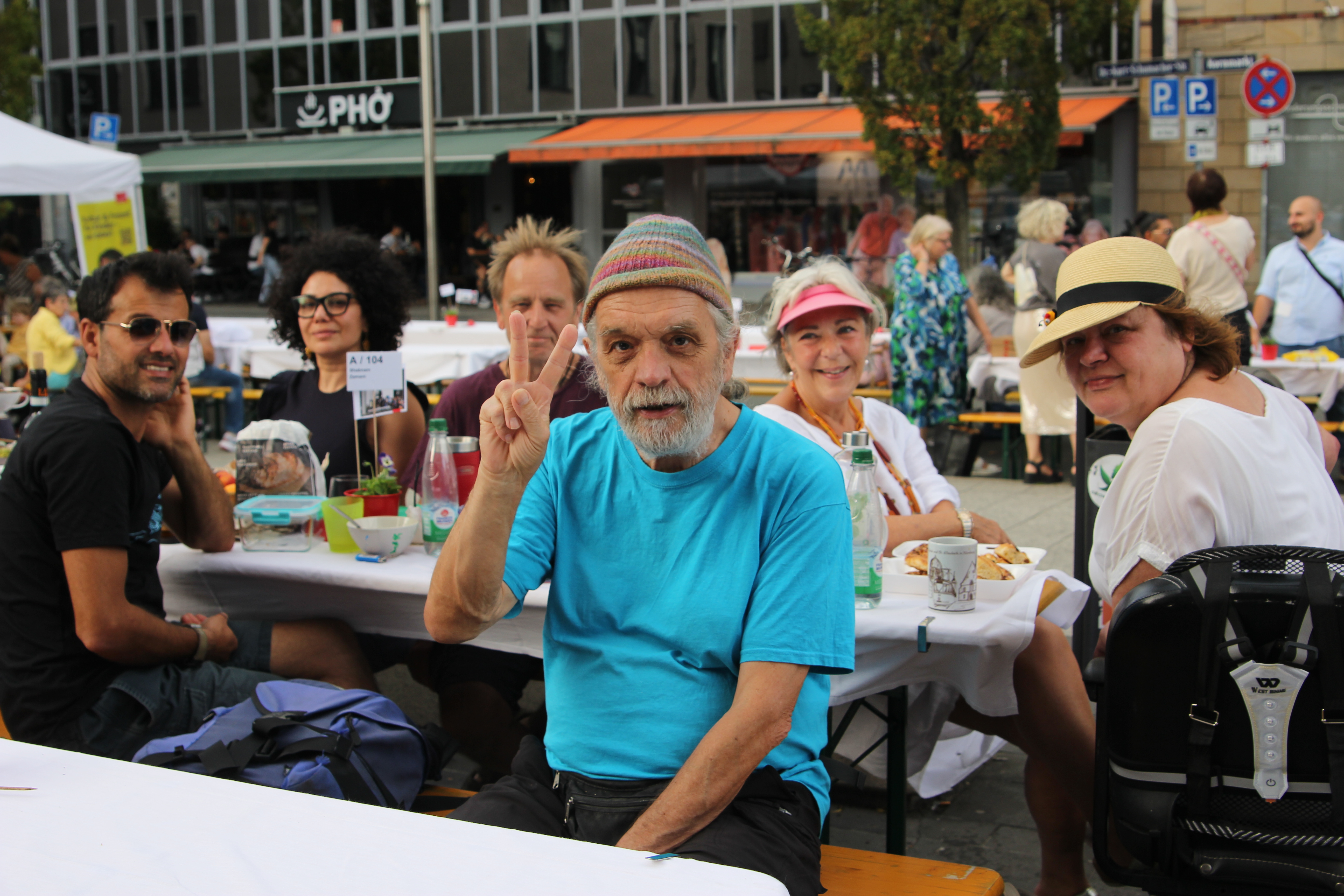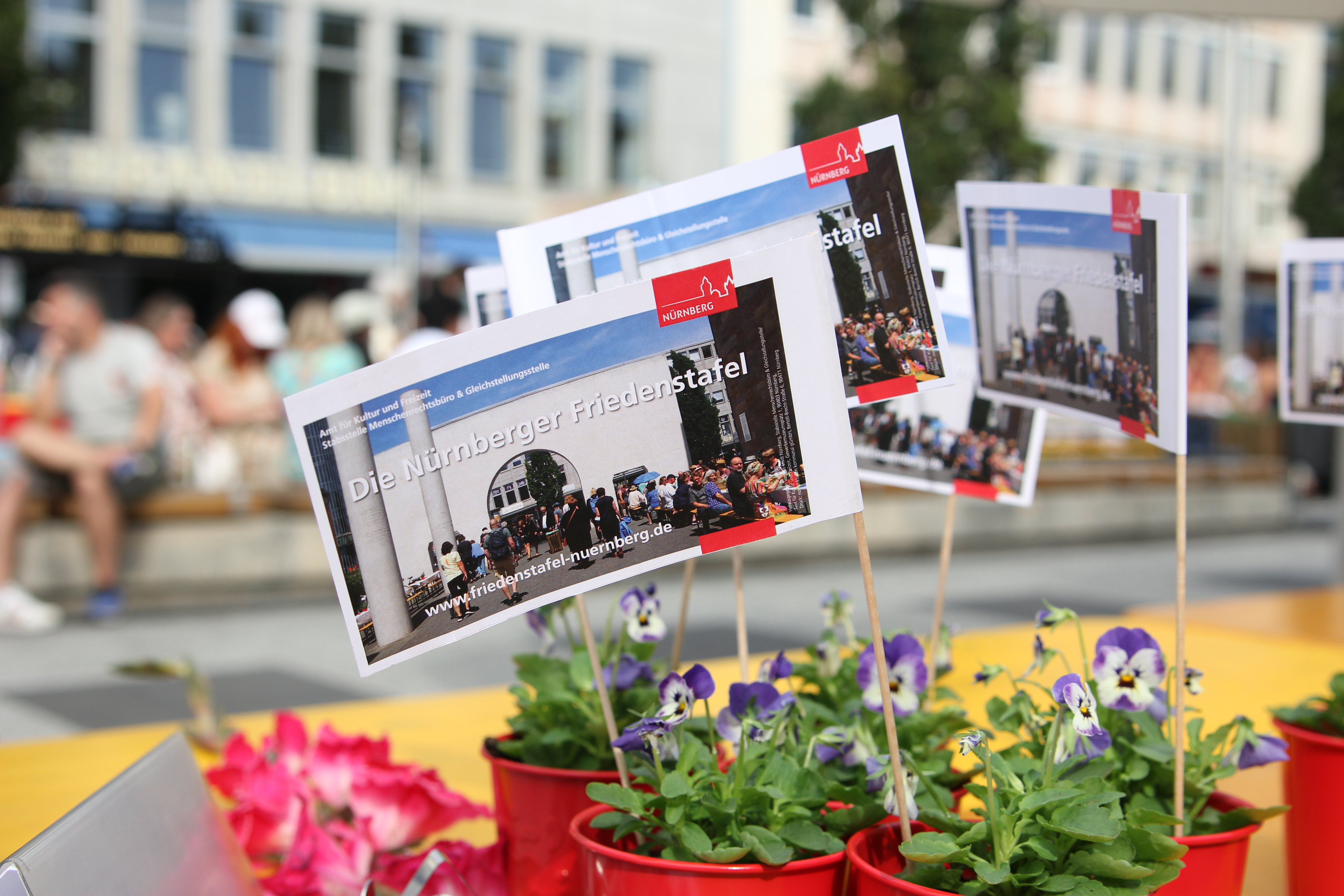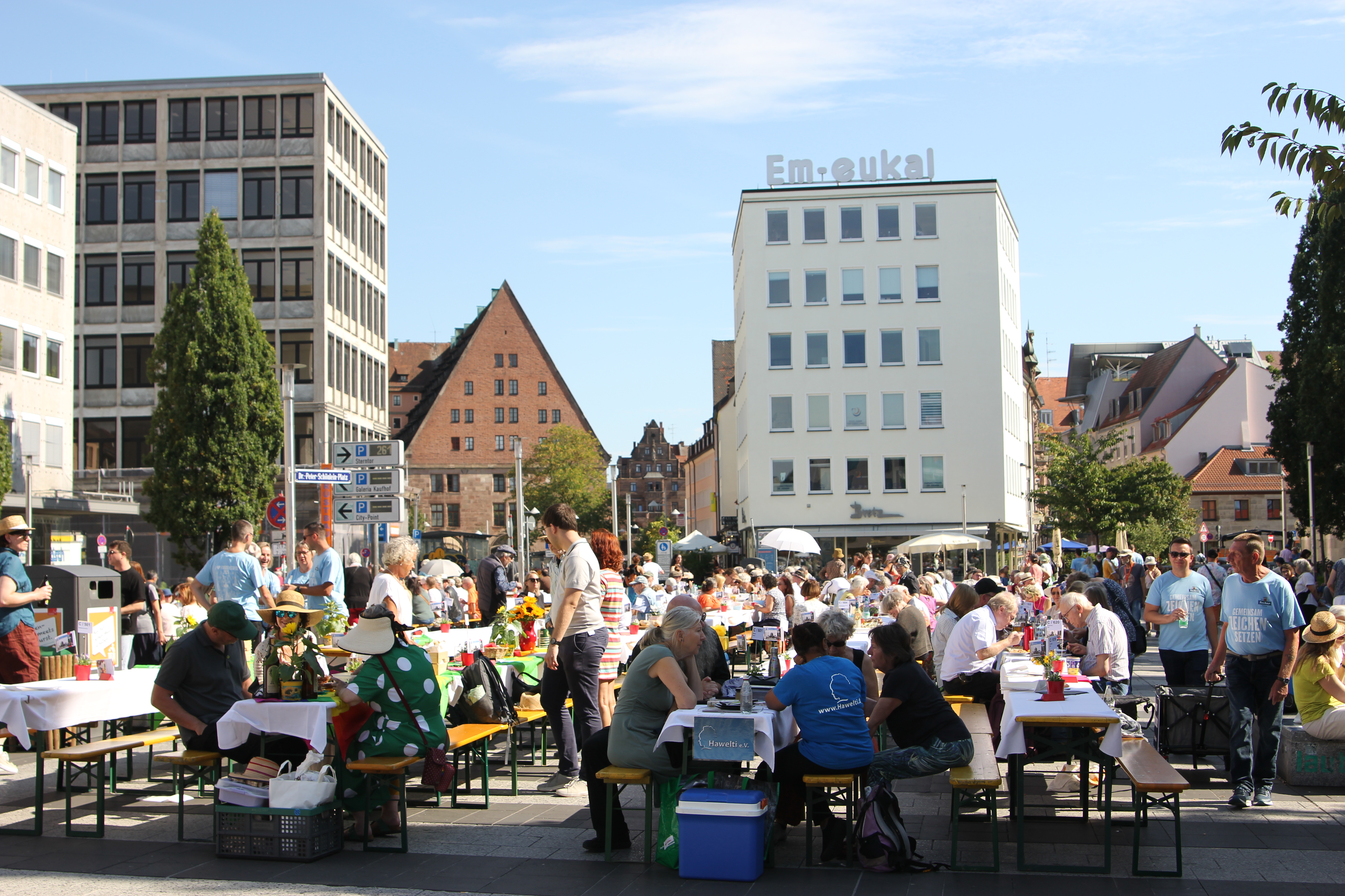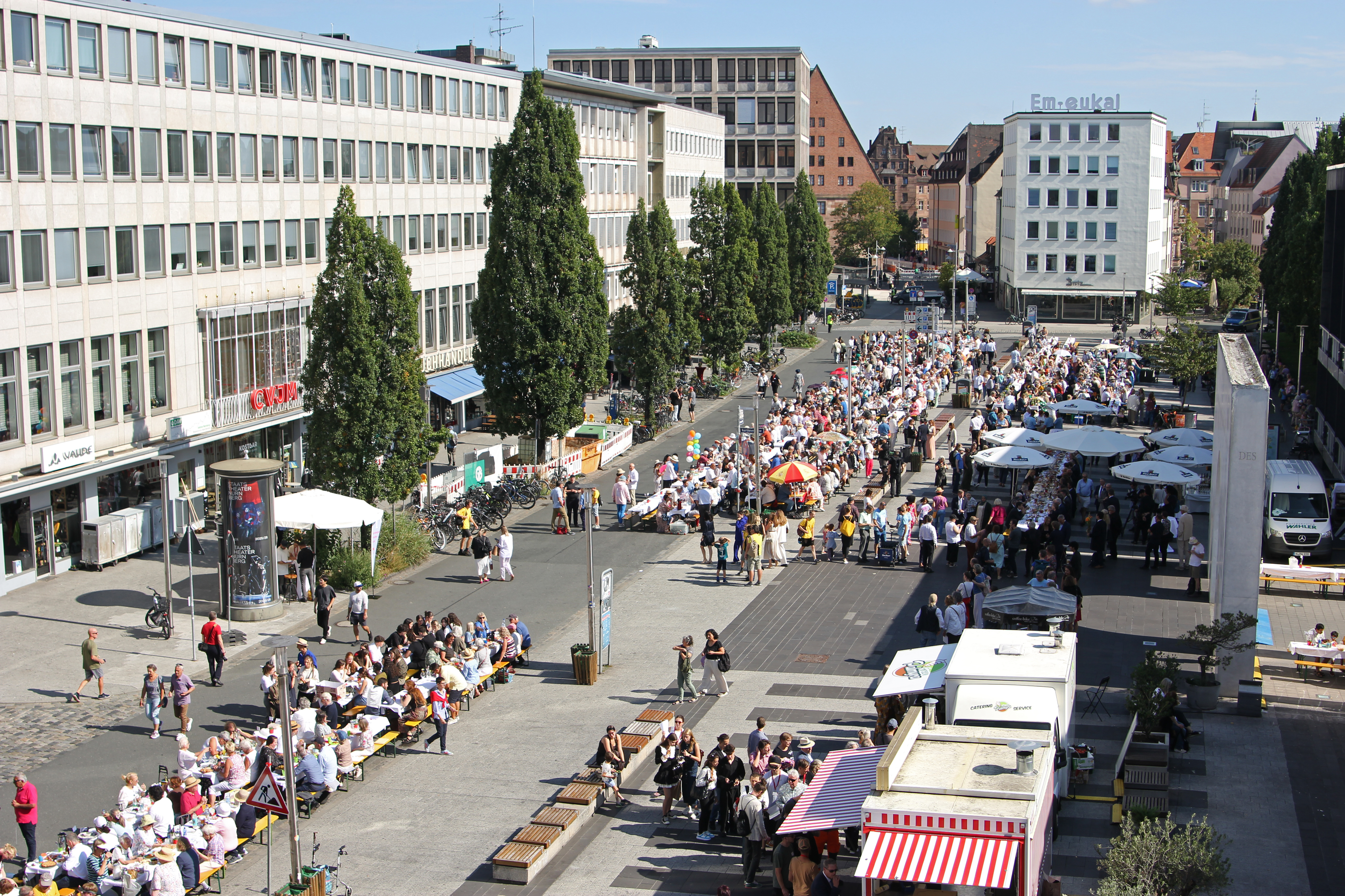 Ab 13 Uhr waren alle Bürgerinnen und Bürger eingeladen, an der Nürnberger Friedenstafel teilzunehmen. Man brachte sich die Verpflegung einfach selbst mit oder nutzte das gastronomische Angebot entlang der Tafel. Tische konnten im Vorfeld für 15 Euro reserviert werden.