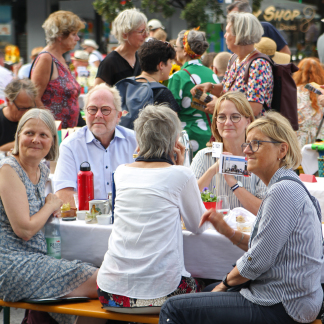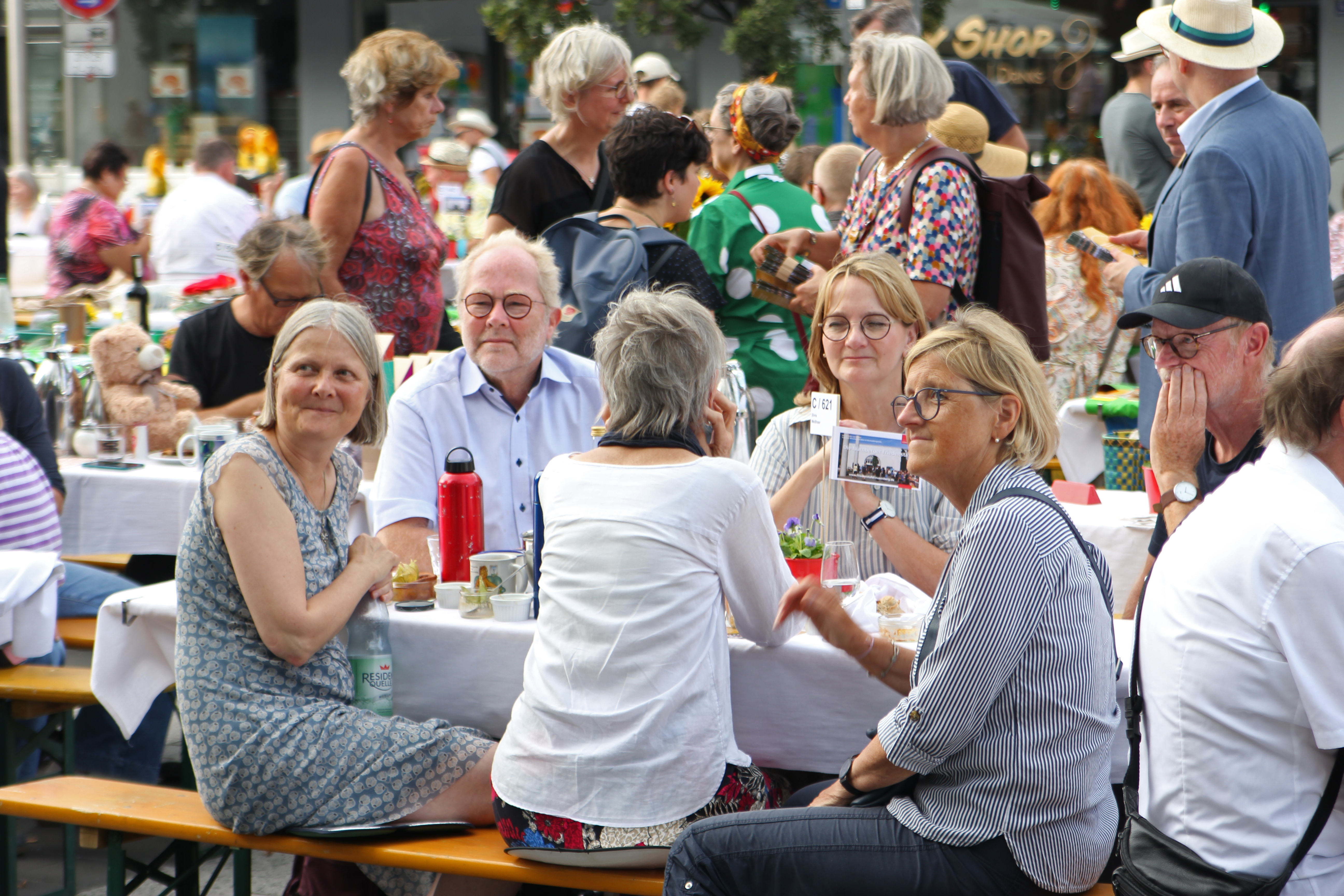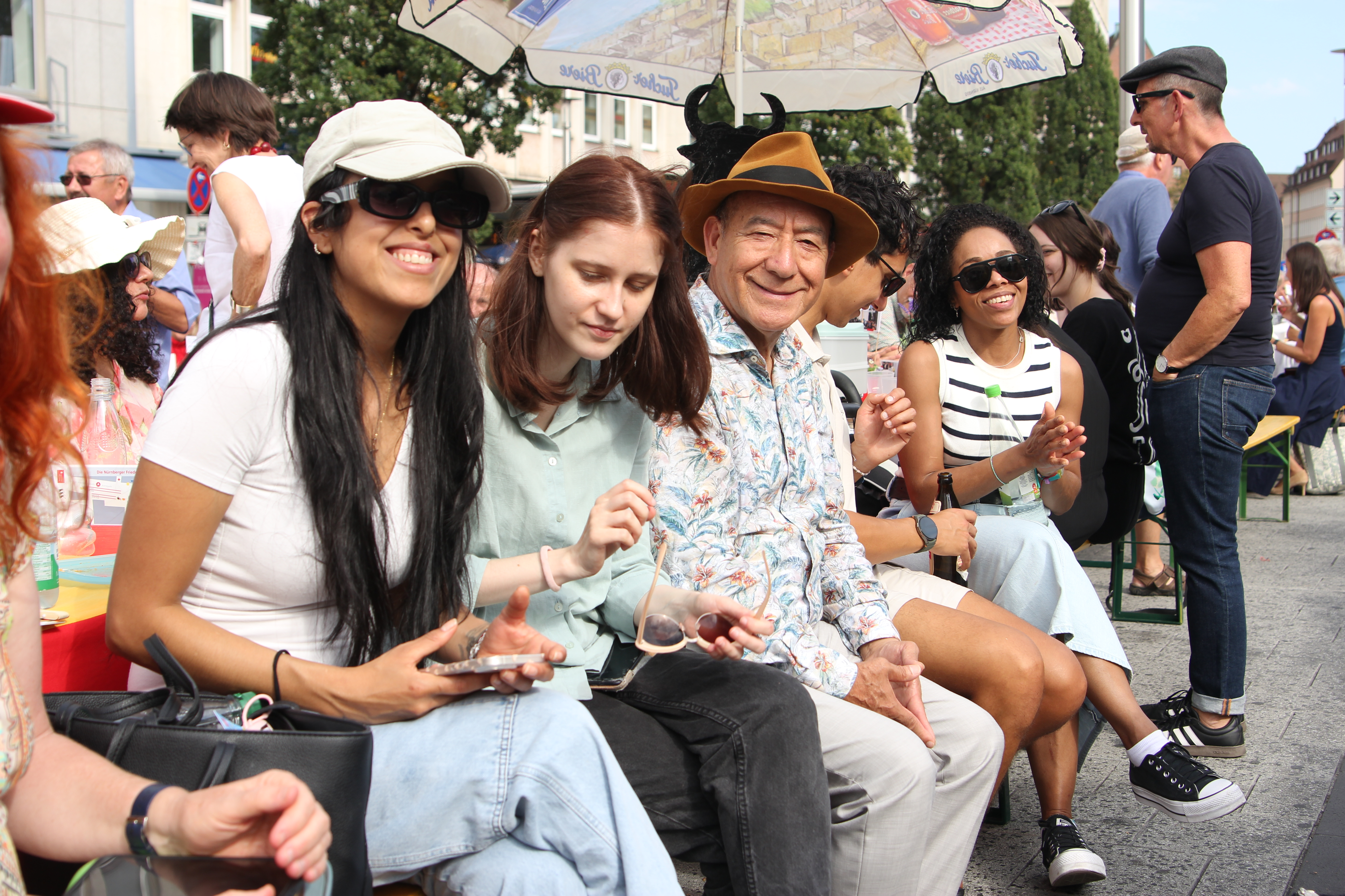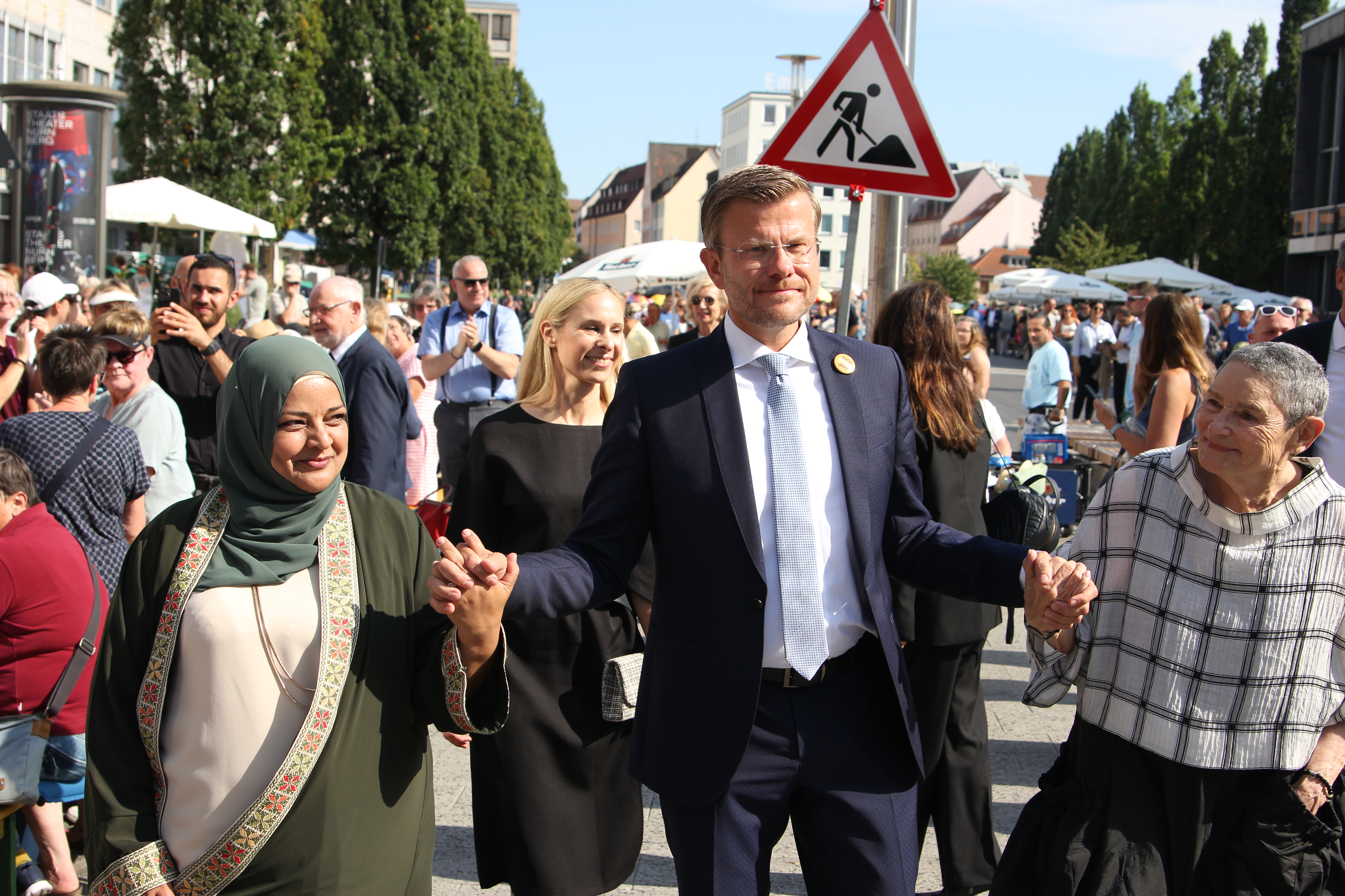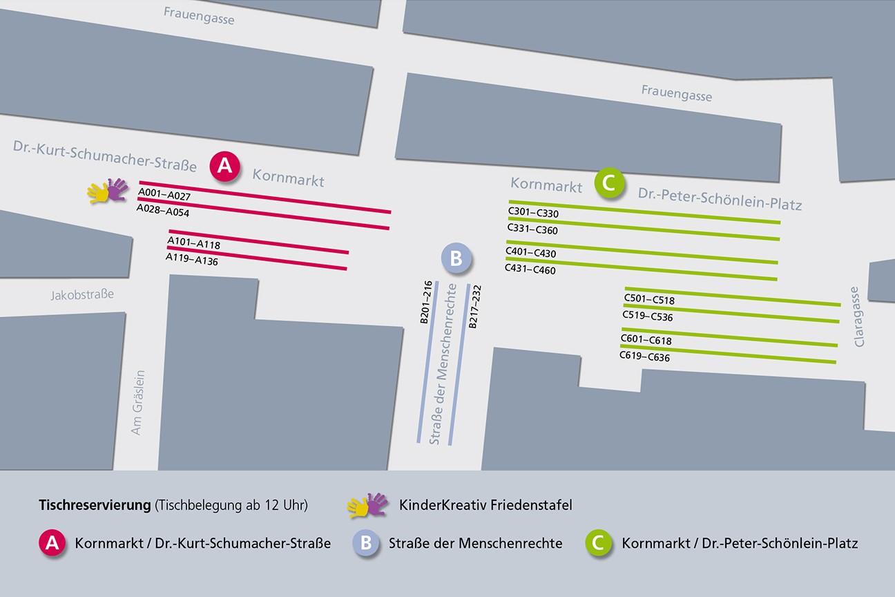 Ab 13 Uhr waren alle Bürgerinnen und Bürger eingeladen, an der Nürnberger Friedenstafel teilzunehmen. Man brachte sich die Verpflegung einfach selbst mit oder nutzte das gastronomische Angebot entlang der Tafel. Tische konnten im Vorfeld für 15 Euro reserviert werden.