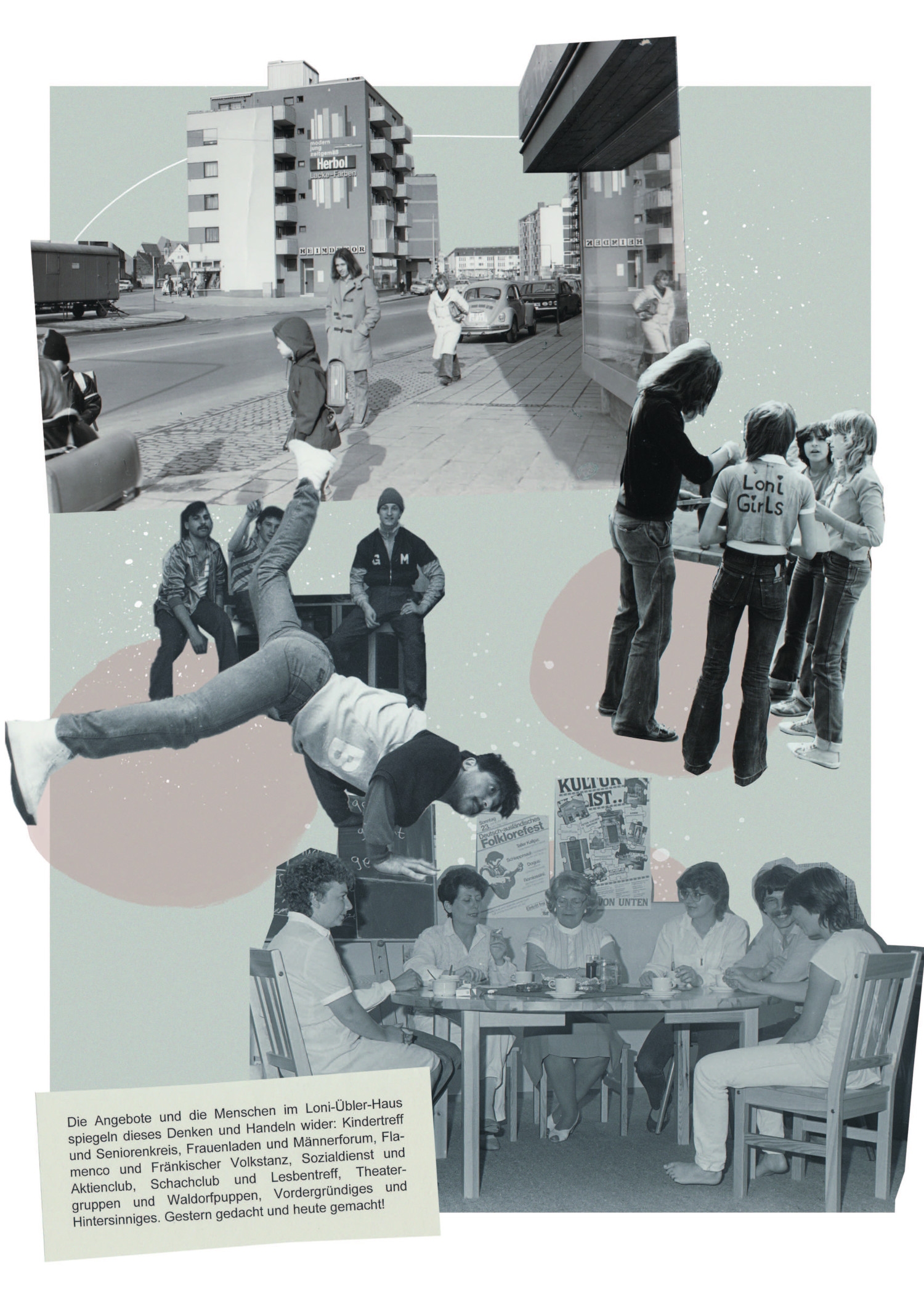 Die Angebote und die Menschen im Loni-Übler-Haus spiegeln dieses Denken und Handeln wider: Kindertreff, Seniorenkreis, Frauenladen und Männerforum, Flamenco und Fränkischer Volkstanz, Sozialdienst und Aktienclub, Schachclub und Lesbentreff, Theatergruppen und Walddorfpuppen, Vordergründiges und Hintersinniges. Gestern gedacht und heute gemacht.